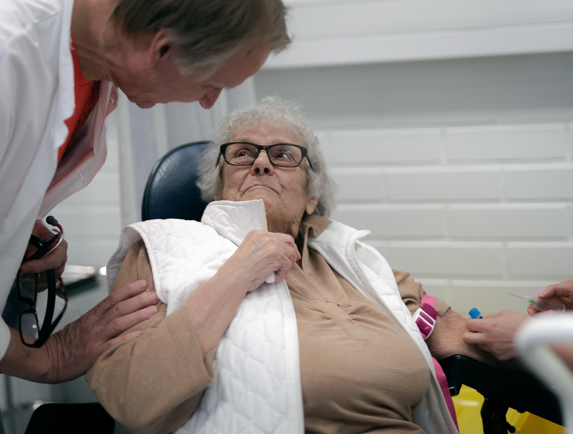 Kun lääkäri ja valokuvaaja astuvat sisään ja hymyilevät, muistisairaisiin naisiin tulee vipinää. Laina Tarvanen, 84, istuu tohtorin polvelle. Uusi asukas Aino Ketola, 95, katsoo nuoren tytön vilpittömillä silmillä.