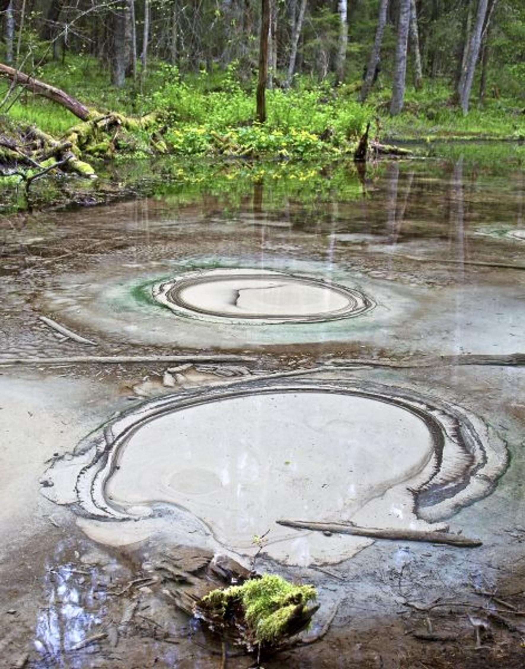Jämijärven Kylmänmyllynlähde tunnetaan lukuisista vaalean hiekan kuvioimista lähteensilmistä.