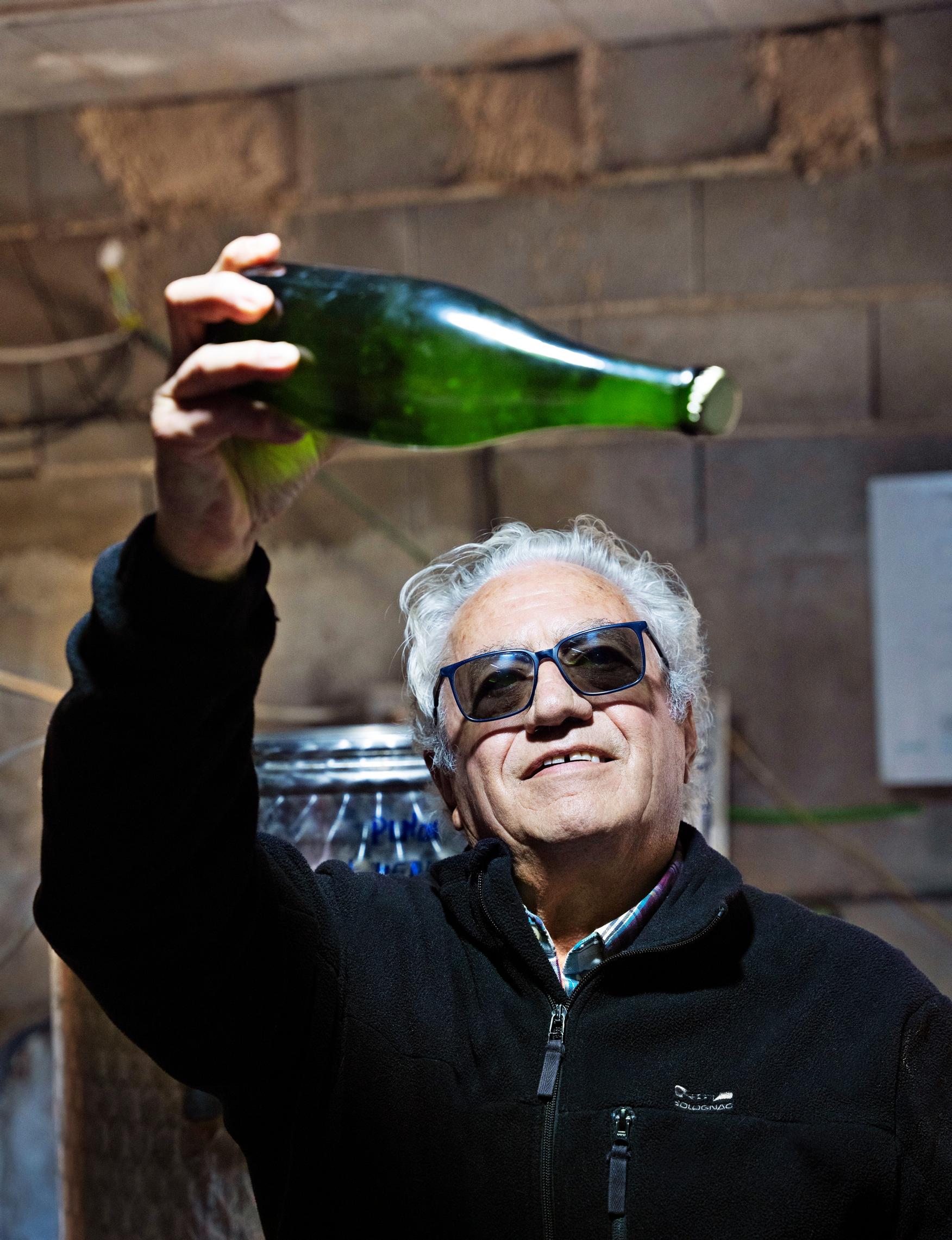 Ilmastonmuutoksen vuoksi viinirypäleissä on nykyään enemmän sokeria, mutta ne ovat kooltaan pienempiä. Se taas merkitsee vähäisempiä litramääriä. Vanhempi Gamés nappaa käteensä kuohuviinipullon ja kääntelee sitä ylösalaisin.