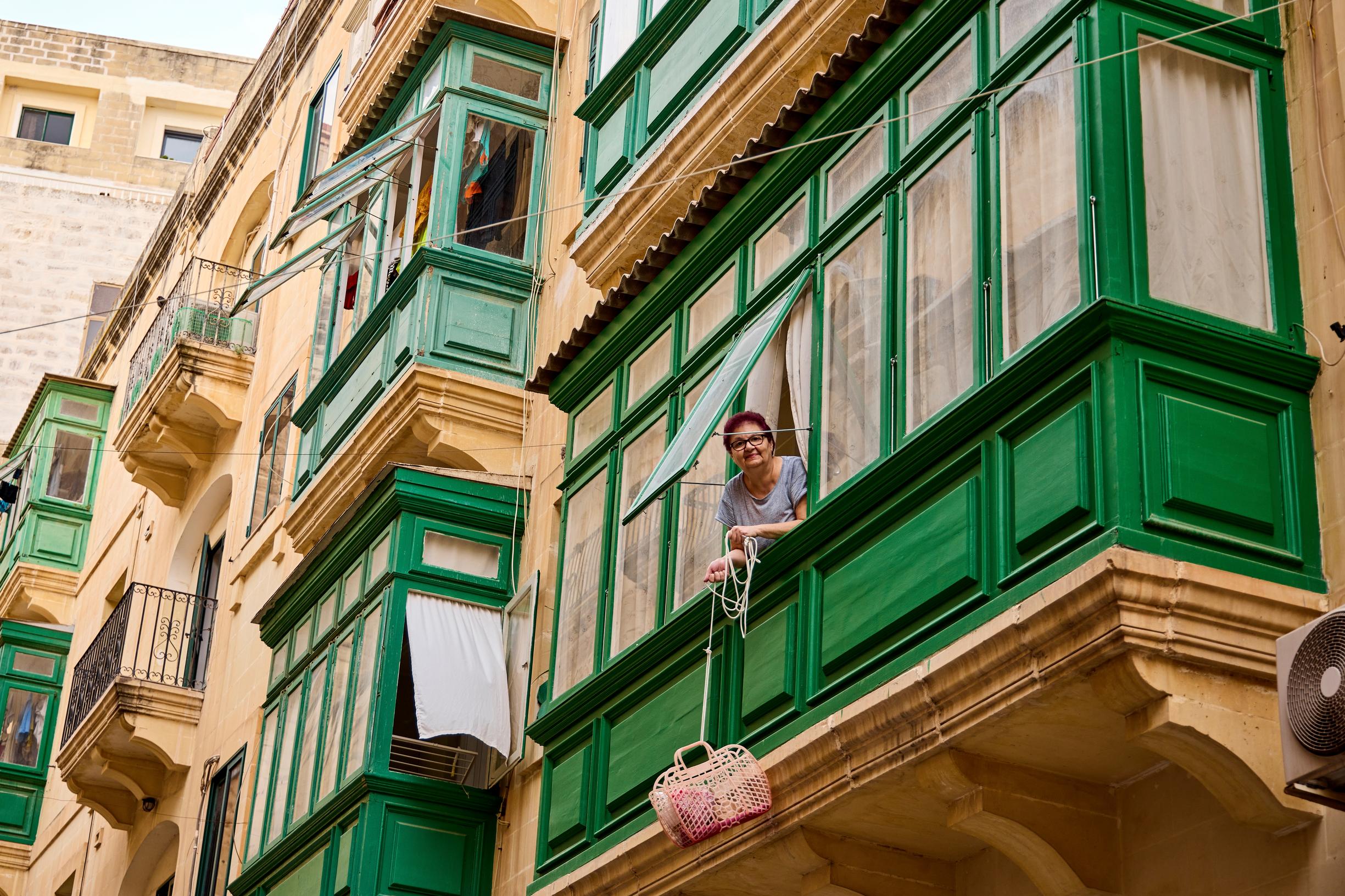 Vallettassa asuintaloja on suhteellisen vähän, mutta täällä kävellessä pääsee helposti näkemään vilahduksia paikallisten arjesta. Tuolta jonkin kodin pitsiverhojen takaa kaikuu television ääni, maltankielinen saippuaooppera. Yhdestä ovesta pelmahtaa kujalle pari tyttöä leikkimään.