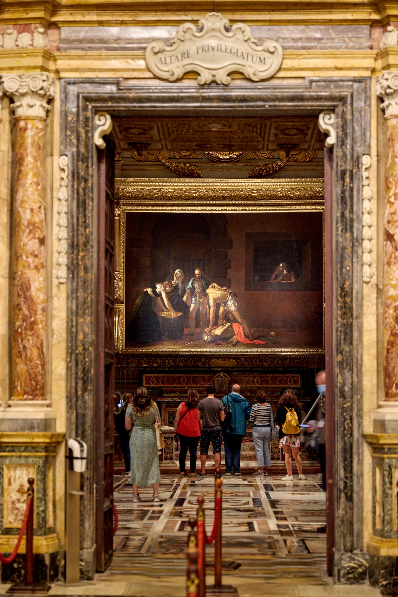 Toinen niistä on niin kuuluisa, että kirkon sivutilassa pyörii melodramaattinen video teoksen synnystä. Kun Caravaggio saapui saarelle vuonna 1607, hän oli jo arvostettu maalari mutta myös tappelijan maineessa. Hän loi mestariteoksensa katedraaliin ritarien tilauksesta, riitautui sitten näiden kanssa ja pakeni Maltalta.
