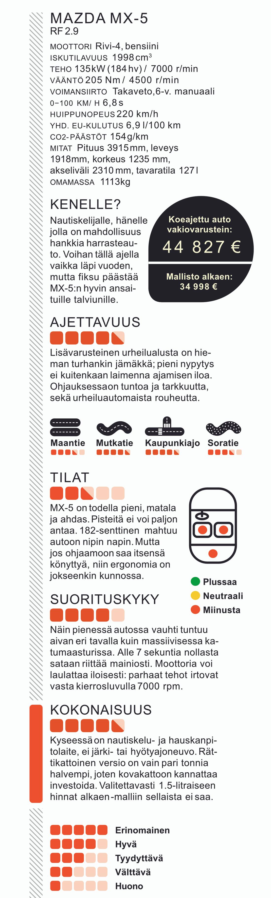 Onneksi kaikkia autoja ei tehdä järki tai käytännöllisyys edellä. Mazdan MX-5 on hyvä esimerkki tällaisesta vaihtoehdosta. Jo yli kolme vuosikymmentä tuotannossa ollut pieni 2-paikkainen roadster on auto, jota kukaan ei oikeasti tarvitse, mutta jollaisesta moni haaveilee.
