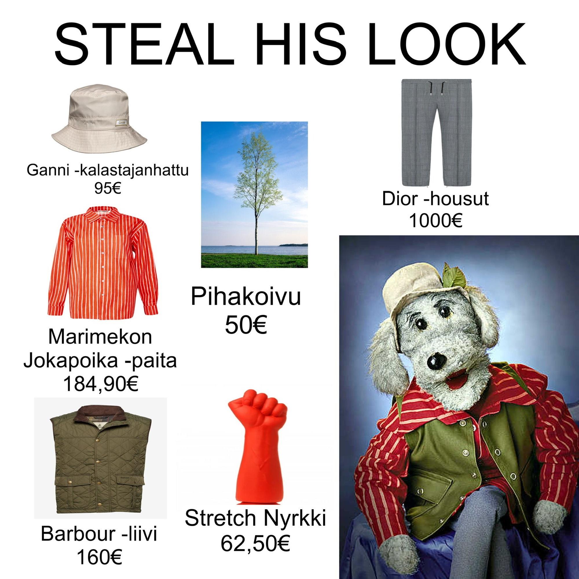 Toisessa Junttasen tekemässä meemissä on Pikku Kakkosesta tuttu Ransu-koira ja ostovinkit Ransun pukeutumistyylin luomiseen: Marimekon Jokapoika-paita 184,90 euroa, pihakoivu 50 euroa, ja niin edelleen.