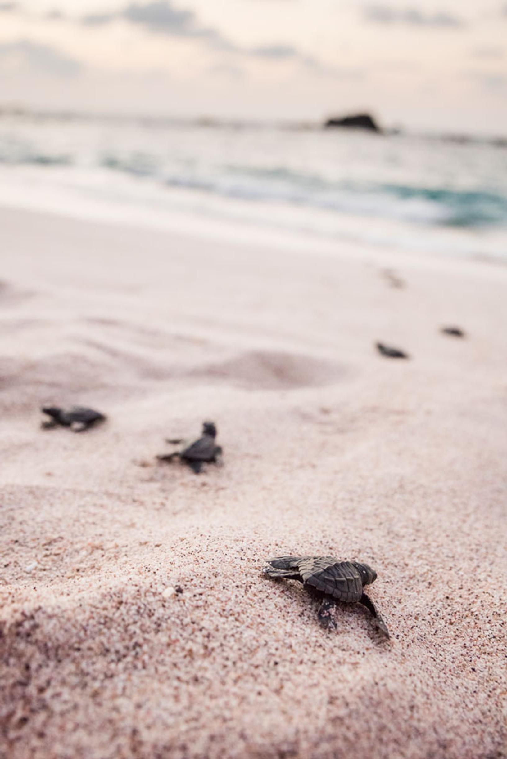 Hoitaja antaa selvät ohjeet. Kukin matkailija saa ottaa varovasti käteensä poikasen ja asettaa sen viivan toiselle puolelle, pää kohti merta. Pian poikaset jo pyrkivät hiekassa kohti ulappaa. Yksi junnaa kauan paikallaan, mutta useimmat niistä vilistävät kovaa vauhtia.