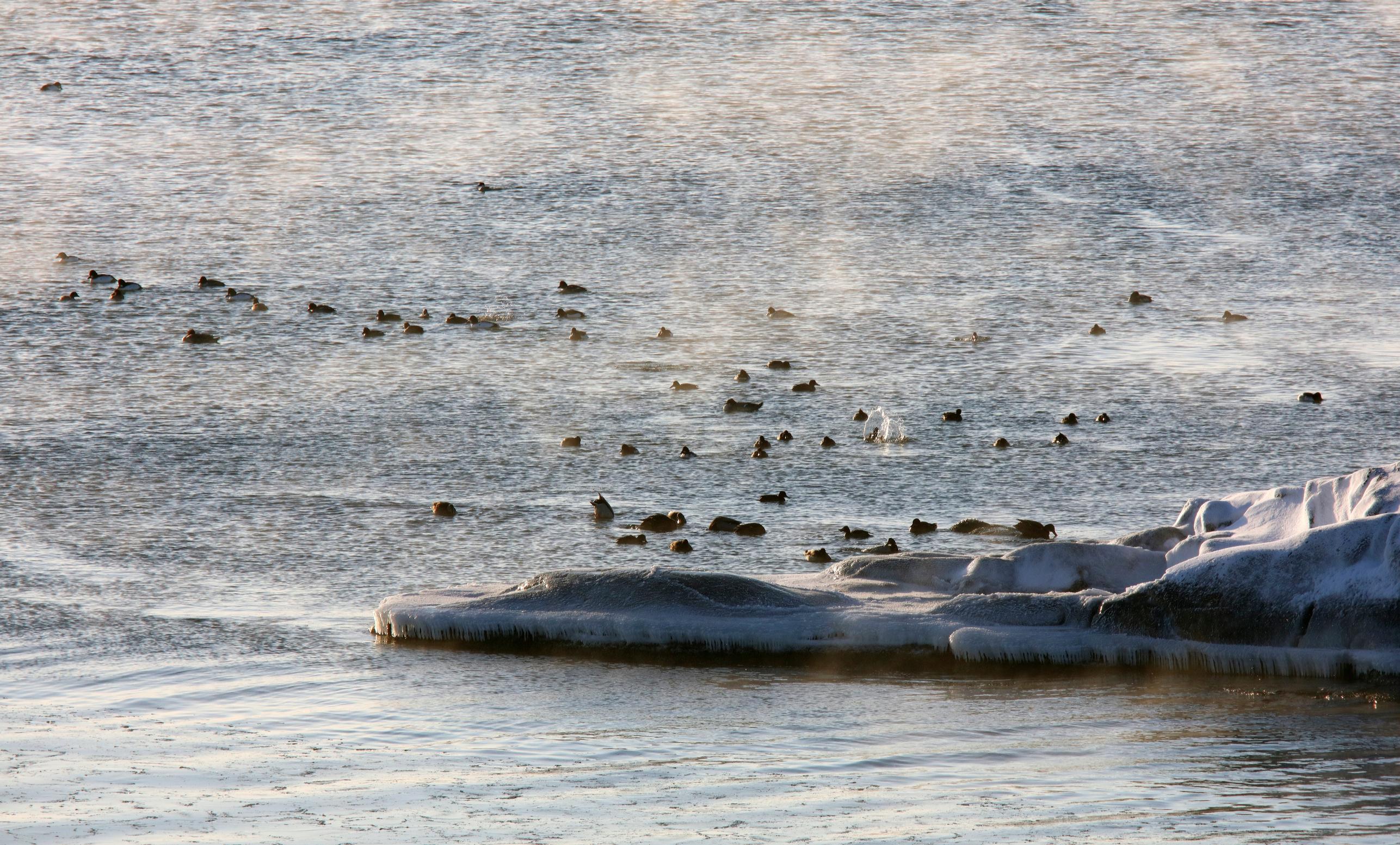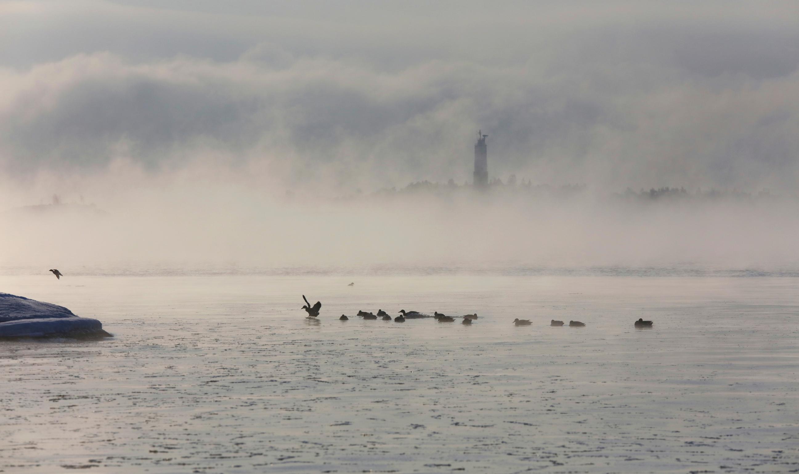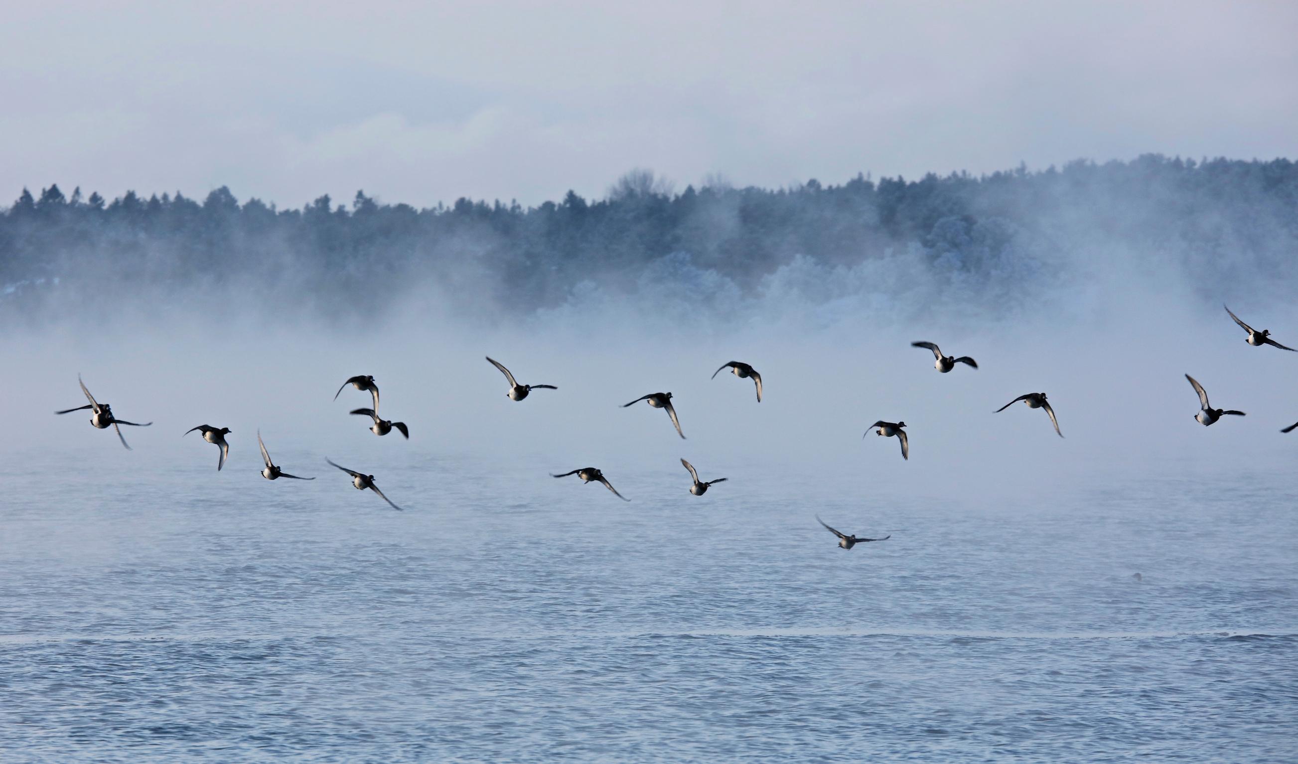 Hyytävä meri ei ole eloton eikä hiljainen. Ulapalla lentelee isokoskeloita, telkkiä, tukkasotkia ja sinisorsia.