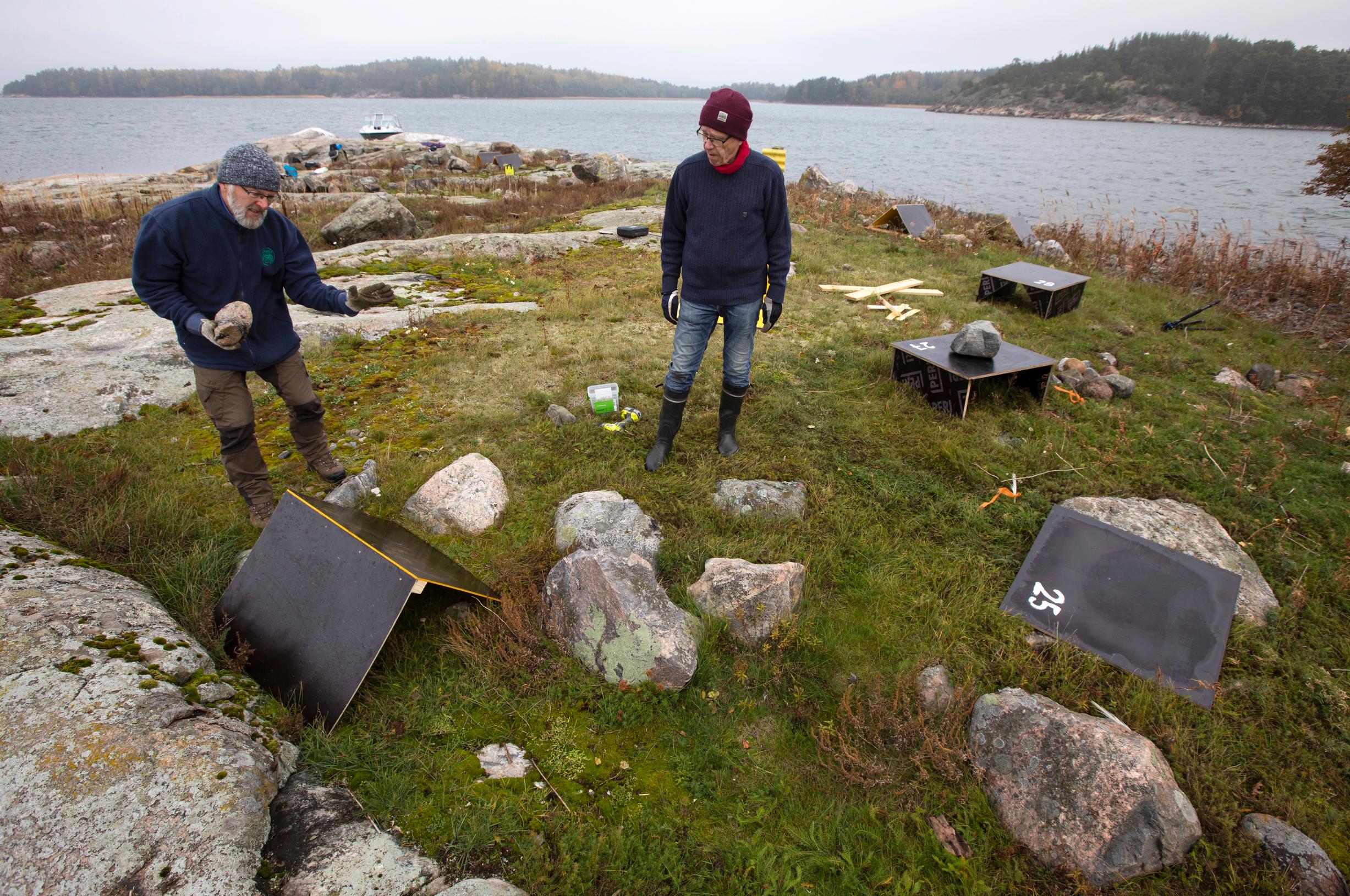 – Rupeamme kasaamaan pesälaatikoita. Hae sinä rannasta suuria kiviä, jotka pitävät ne paikoillaan pahimmissakin myrskyissä, Jouko Högmander neuvoo.