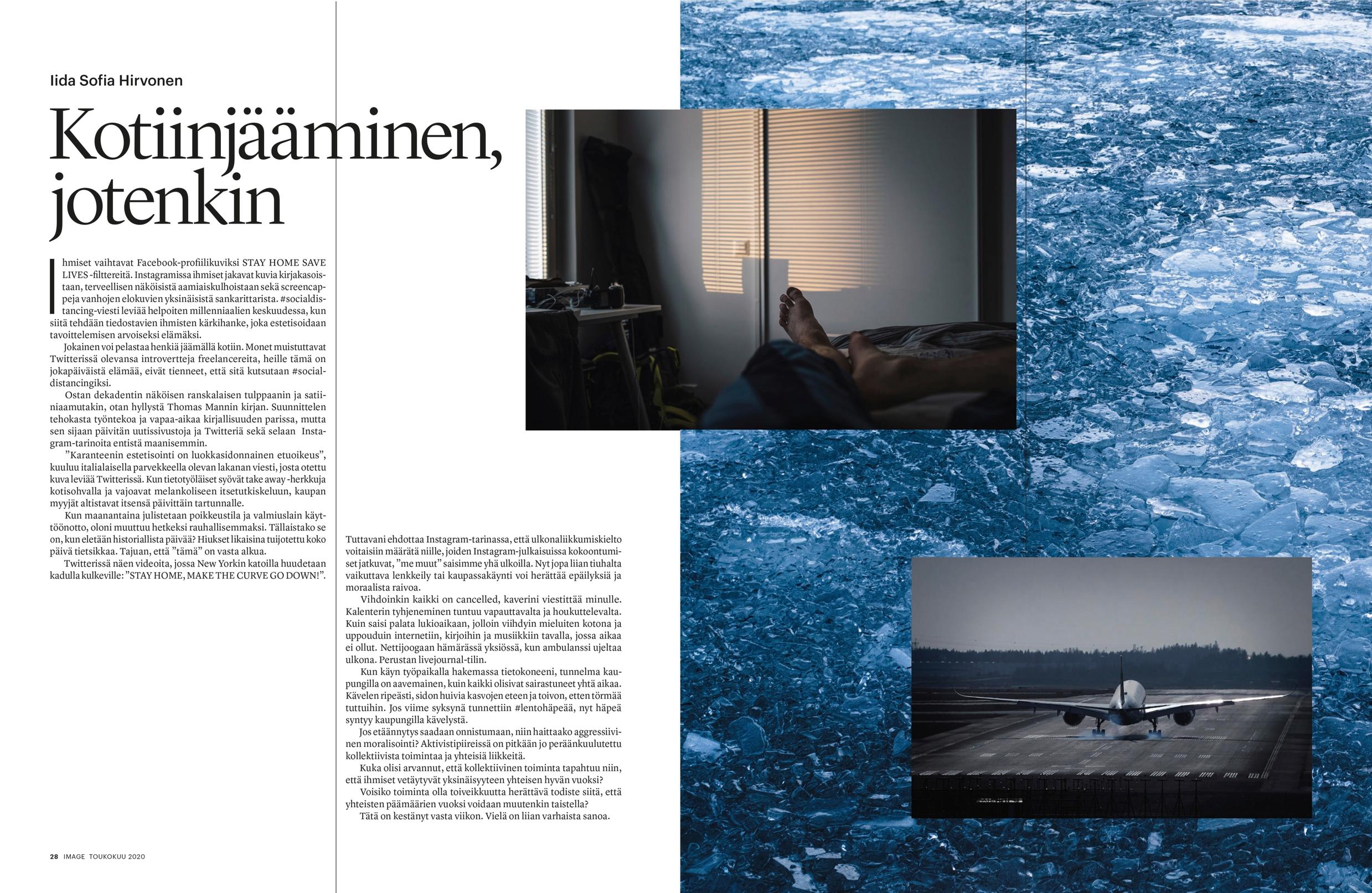 Ihmiset vaihtavat Facebook-profiilikuviksi stay home save lives -filttereitä. Instagramissa ihmiset jakavat kuvia kirjakasoistaan, terveellisen näköisistä aamiaiskulhoistaan sekä screencappeja vanhojen elokuvien yksinäisistä sankarittarista. #socialdistancing-viesti leviää helpoiten millenniaalien keskuudessa, kun siitä tehdään tiedostavien ihmisten kärkihanke, joka estetisoidaan tavoittelemisen arvoiseksi elämäksi.