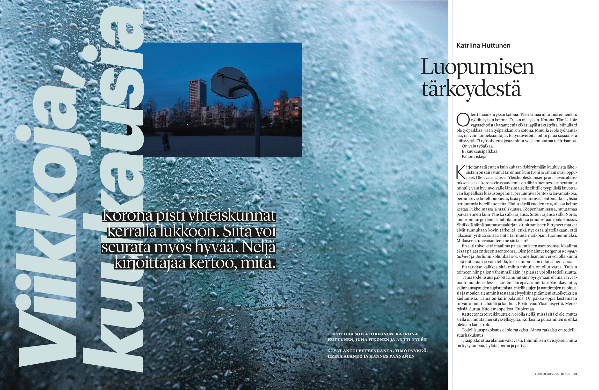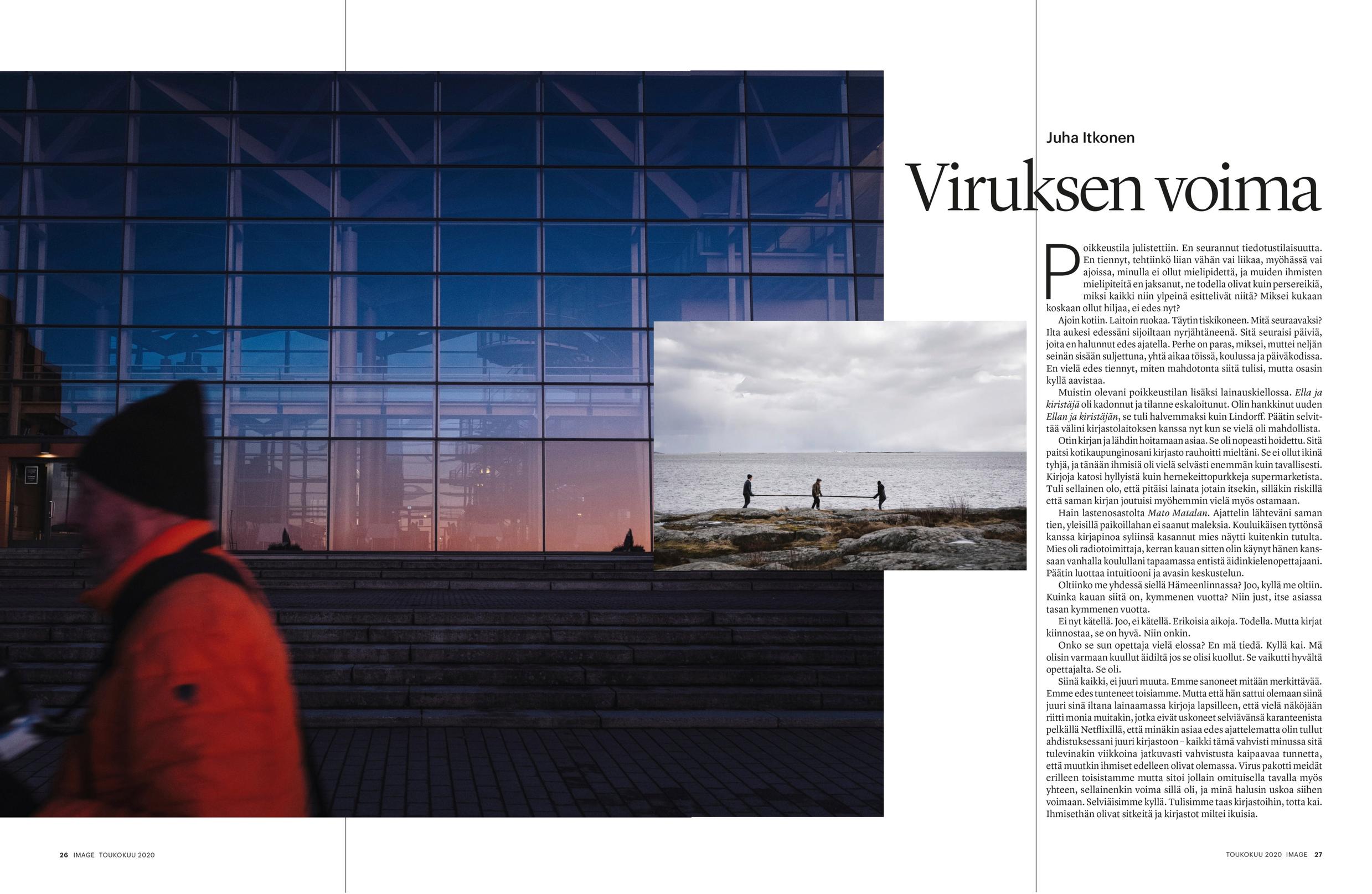 Siinä kaikki, ei juuri muuta. Emme sanoneet mitään merkittävää. Emme edes tunteneet toisiamme. Mutta että hän sattui olemaan siinä juuri sinä iltana lainaamassa kirjoja lapsilleen, että vielä näköjään riitti monia muitakin, jotka eivät uskoneet selviävänsä karanteenista pelkällä Netflixillä, että minäkin asiaa edes ajattelematta olin tullut ahdistuksessani juuri kirjastoon – kaikki tämä vahvisti minussa sitä tulevinakin viikkoina jatkuvasti vahvistusta kaipaavaa tunnetta, että muutkin ihmiset edelleen olivat olemassa. Virus pakotti meidät erilleen toisistamme mutta sitoi jollain omituisella tavalla myös yhteen, sellainenkin voima sillä oli, ja minä halusin uskoa siihen voimaan. Selviäisimme kyllä. Tulisimme taas kirjastoihin, totta kai. Ihmisethän olivat sitkeitä ja kirjastot miltei ikuisia.