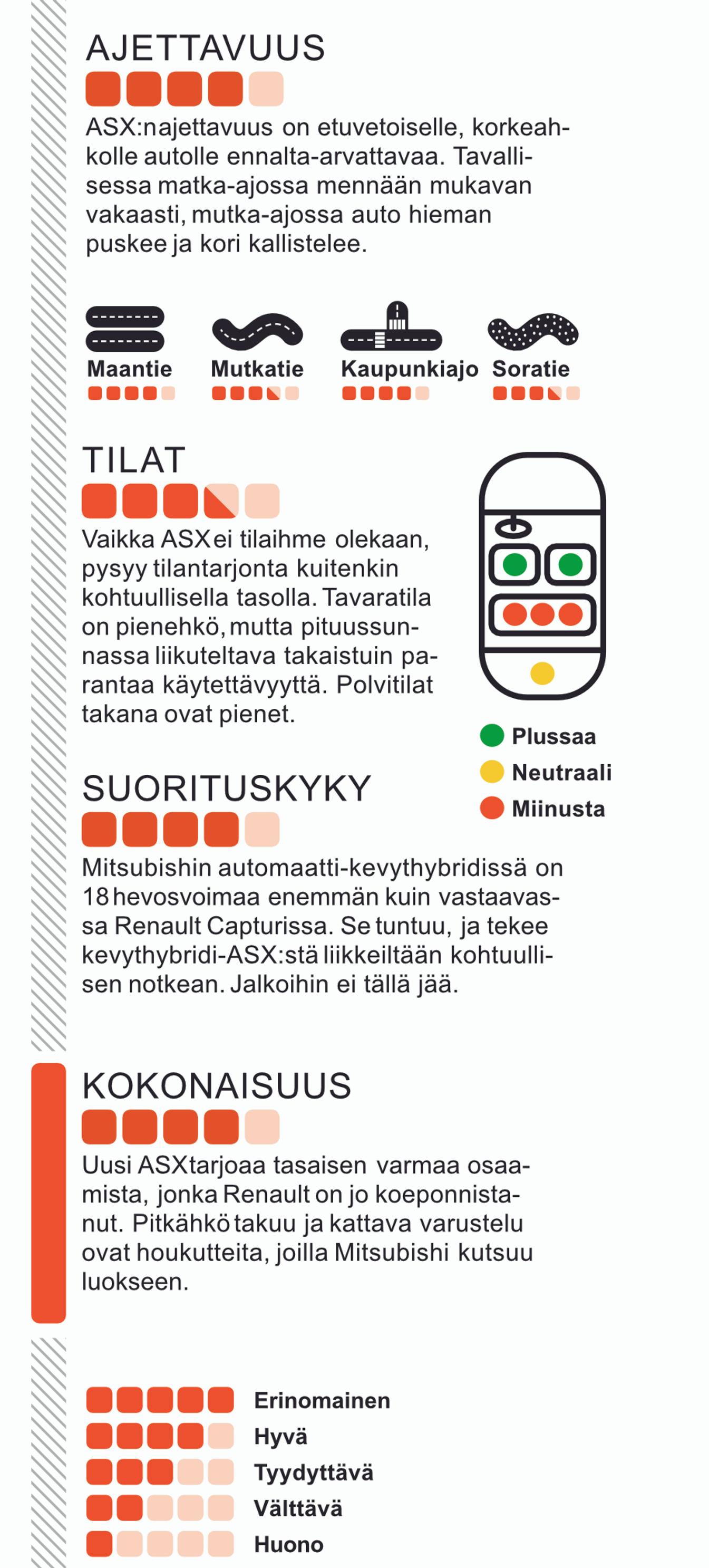 Bensiini- ja hybridimallien varustetasosisällöt eivät ole samansisältöiset, mutta korkea varustelutaso, viiden vuoden takuu ja kevythybridi-automaatin 18 lisäheppaa Capturiin verrattuna erottavat ASX:n parhaiten kanssasisarestaan. Myös ASX:n kokoluokassa pätevä, pehmeyttäkin tarjoava jousitus miellytti ensityyppien aikana.
