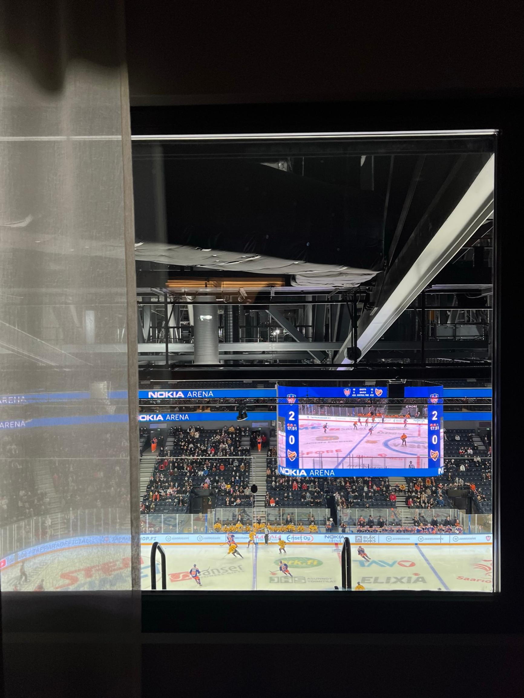 Puoli seitsemältä kiekko tipahtaa jäähän ja peli käynnistyy. Sitä tulee lopulta katsottua vain aition puolelta, ja miksipä peliä nyt ihmettelisikään ikkunalasin läpi. Jos ei kaipaa yöpymismahdollisuutta, tarjolla on myös kokoustiloja omalla aitiolla. Mutta onhan hotellihuone areenanäkymin mieleenpainuvampi elämys.