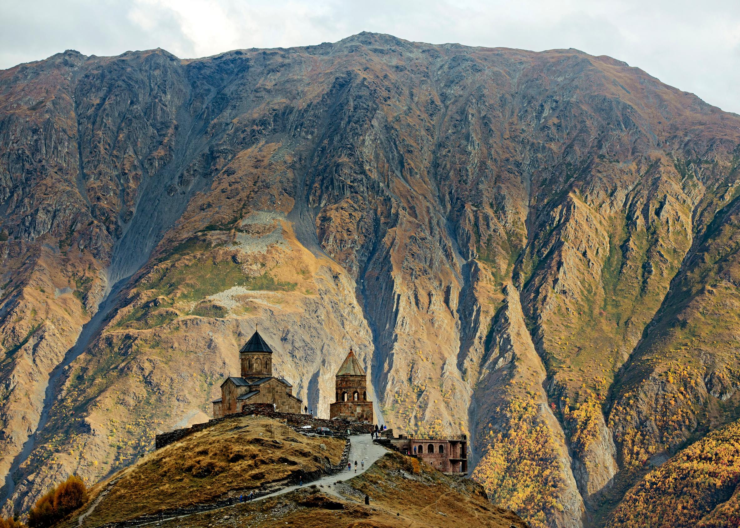 Georgian vuoristomaisemat ovat huikeita. Gergerin luostari seisoo korkeiden huippujen ympäröimänä Stepantsmindassa.