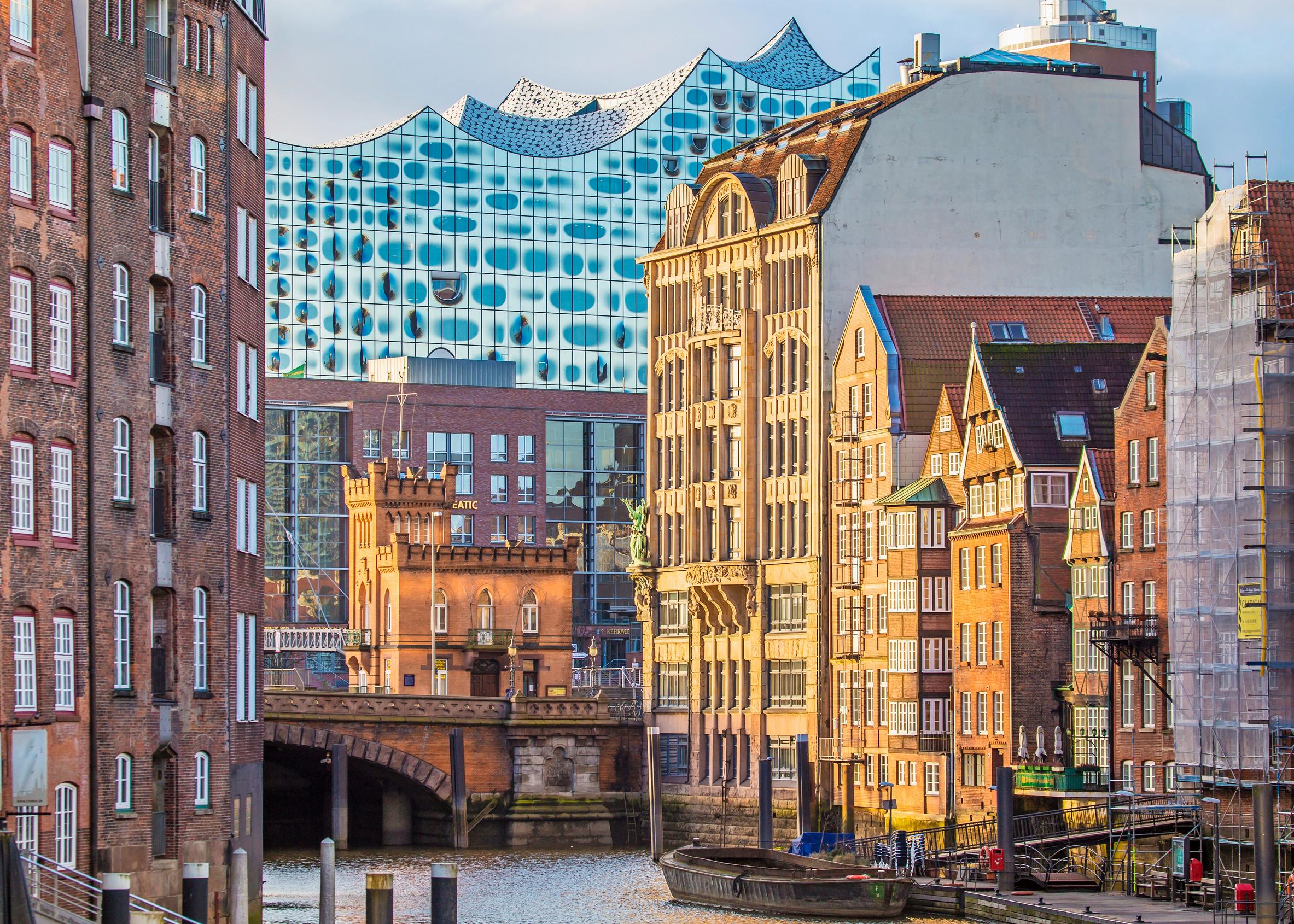 Speicherstadtin historiallisten rakennusten taustalla pilkottaa konserttitalo Elbphilharmonie.