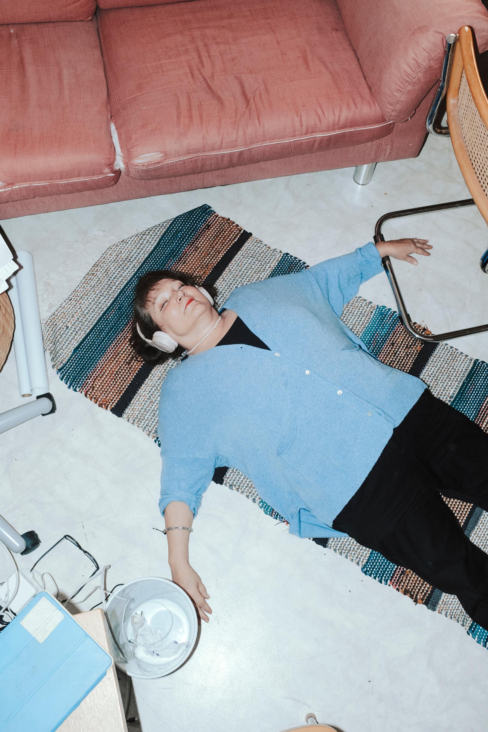 Fagerholmin vaaleanpunaiset JBL:n kuulokkeet kulkevat mukana kaikkialla: autoillessa, kirjoituskurssilla, haastattelussa. Ne voi nähdä hänen kaulallaan kirjailijakuvissakin.