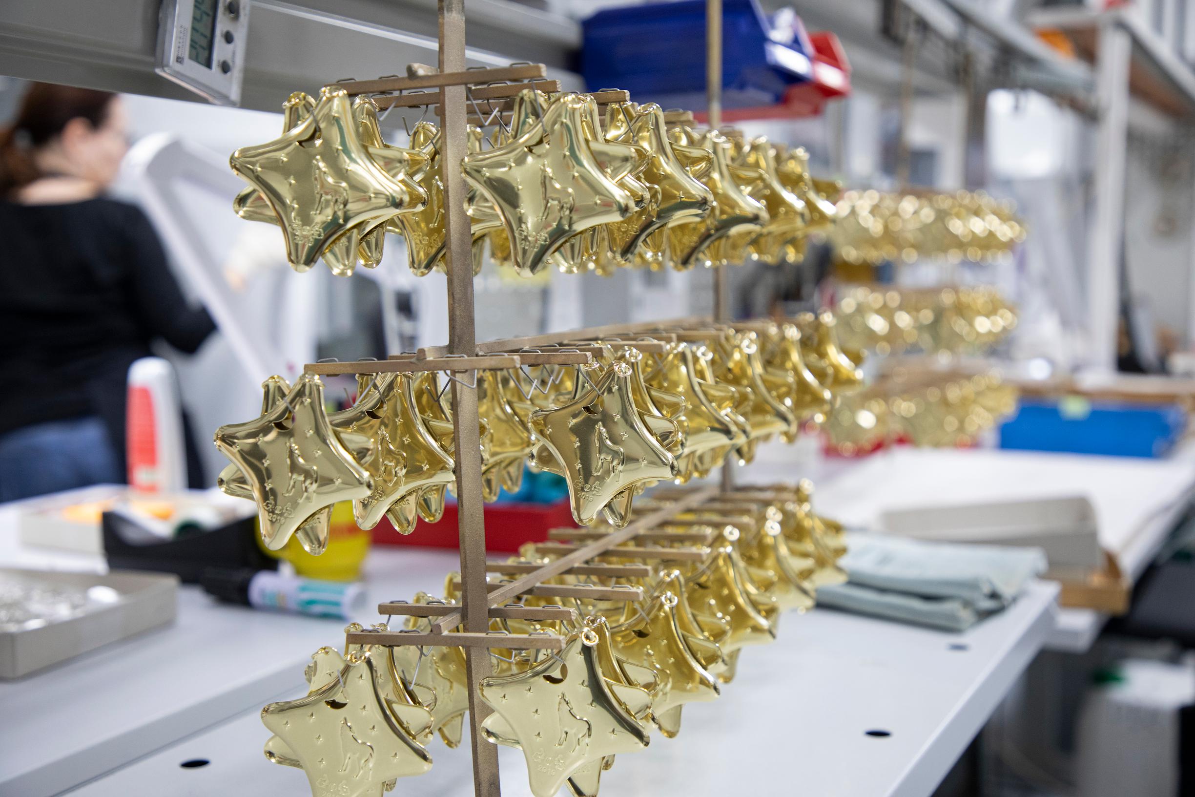 Kultaseppä Petra Sorosella on työn alla Kuutar-riipuksia. Kuutar on Paaerin 1940-luvulla suunnittelema luomus ja yksi Kalevala Korun kautta aikain myydyimmistä koruista.
