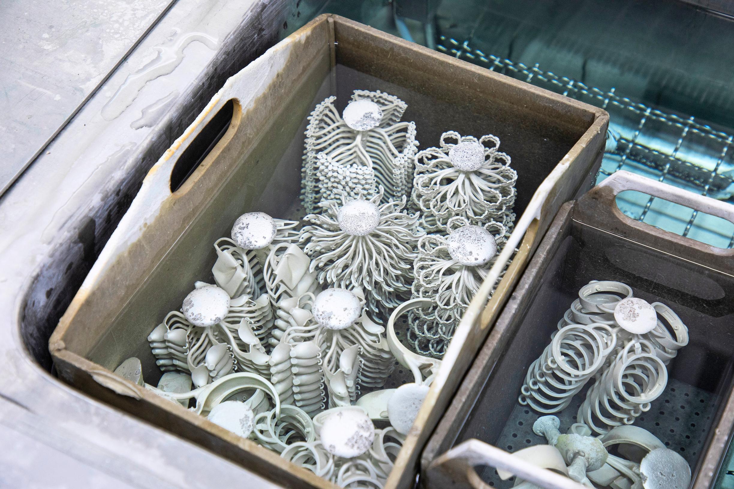 Harmaala Chaloffilla on käytössään haptinen hiiri, mikä tarkoittaa, että hän voi tuntea hiiren kautta korumallin kolmiulotteisena esineenä kädessään ja työstää sitä tietokoneella. Virtuaalisesta mallista tulostetaan 3D-tulostimella vaha-aihioita.
