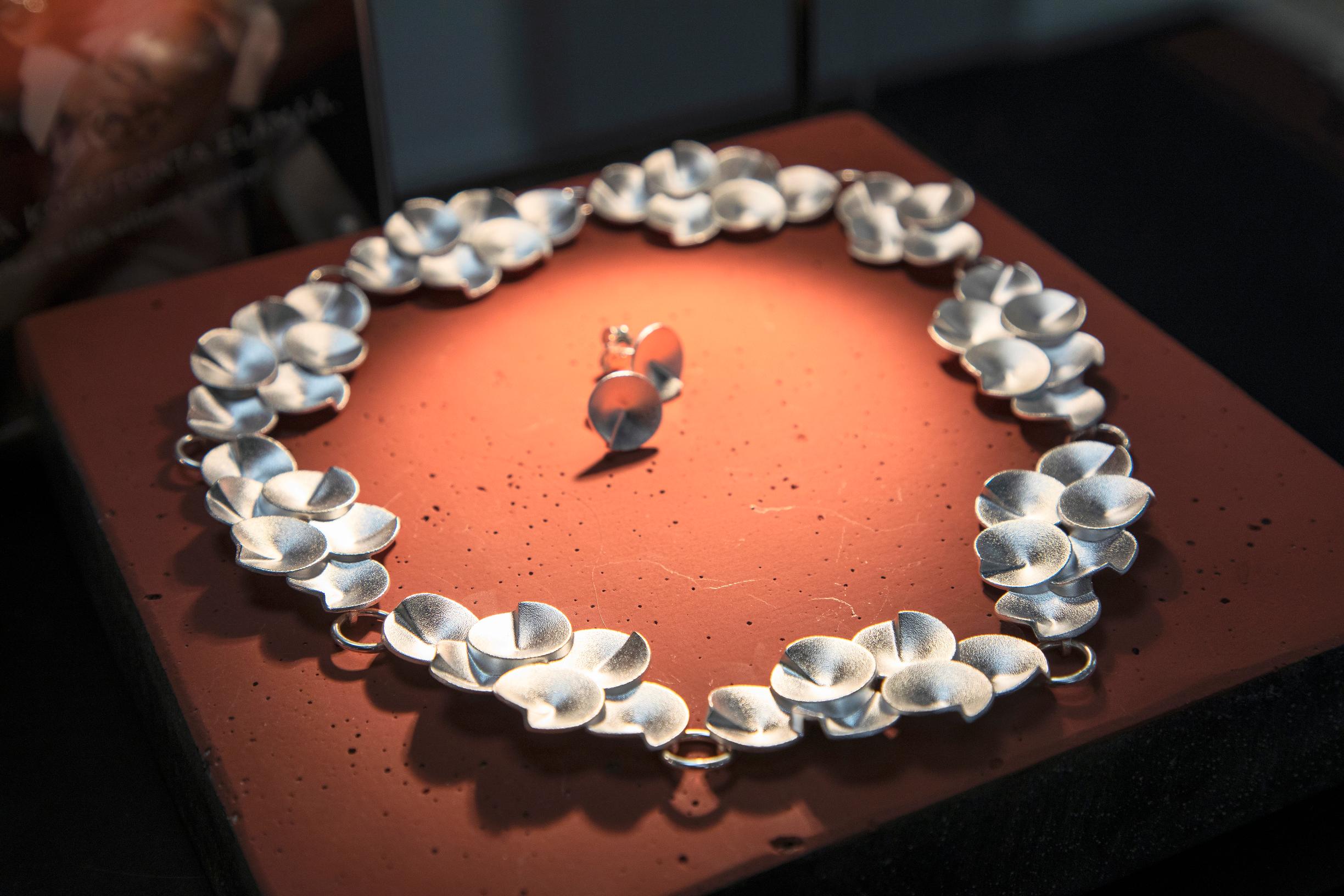 – Olen tehnyt taiteilijan kanssa kaulakorumallin hänen maalauksensa pohjalta. Eräs taiteilija toi nähtäväksi puunoksia, joista hän haki inspiraatiota koruun. On tärkeää, että mallisepän ja taiteilijan vuoropuhelu toimii, Harmaala Chaloff kertoo.
