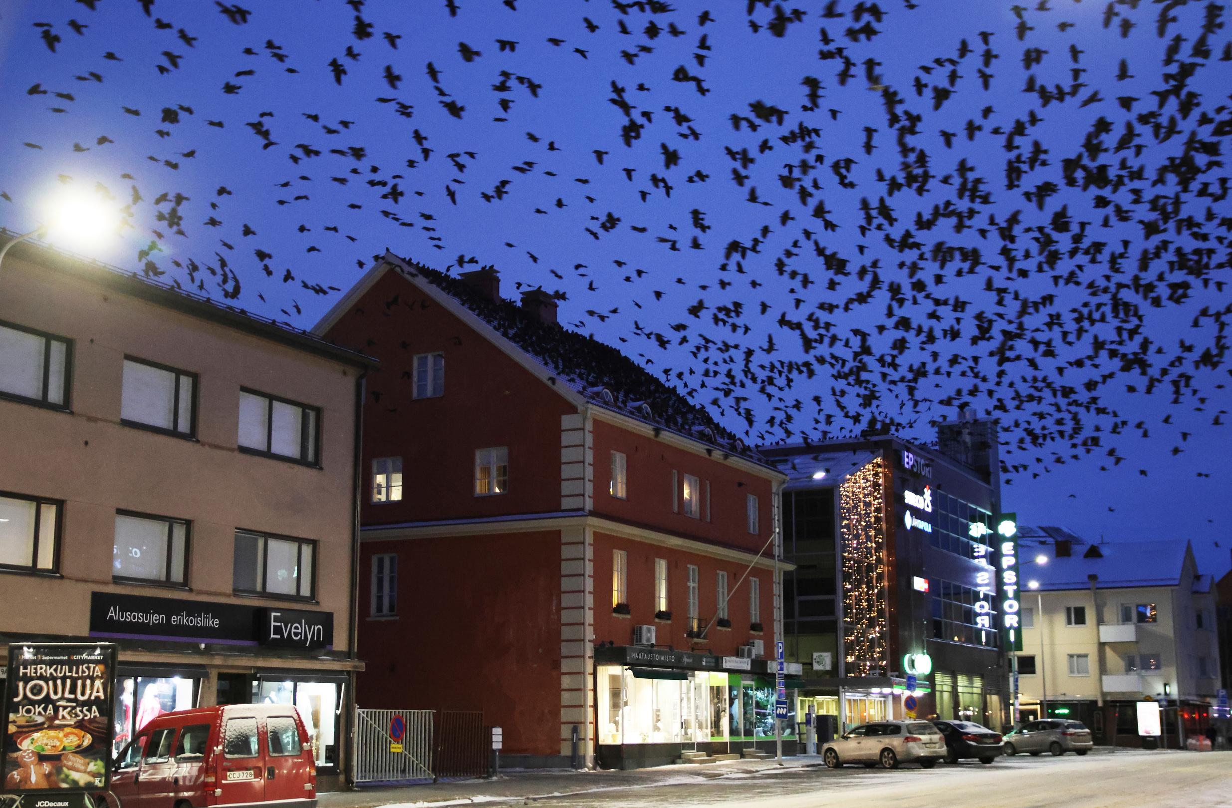 Talvella naakkaparvet pimentävät iltataivaan Seinäjoella – Naakka voi nousta parven hierarkiassa pariutumalla