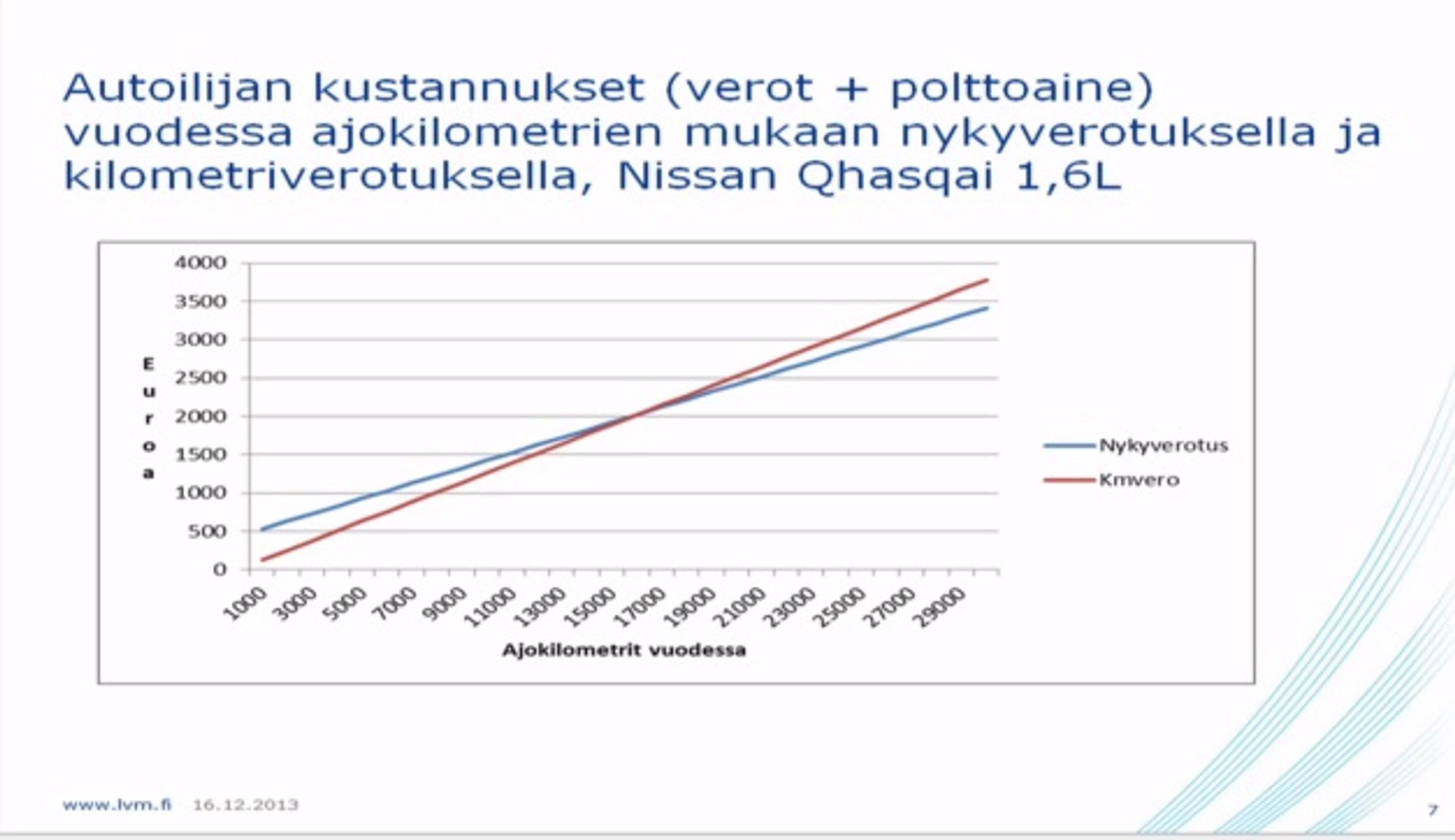 Liikenne- ja viestintäministeriön työryhmä toteaa, että Suomessa on syytä edetä autoilun verotuksessa kohti kilometriveron käyttöönottoa. Asiassa tulisi edetä kokeilujen ja siirtymävaiheen kautta. Työryhmä arvioi, että kilometriverojärjestelmä (oletettu 3,3 snt/km työryhmän laskelmissa) voisi korvata autoverotuksen vuoteen 2025 mennessä.