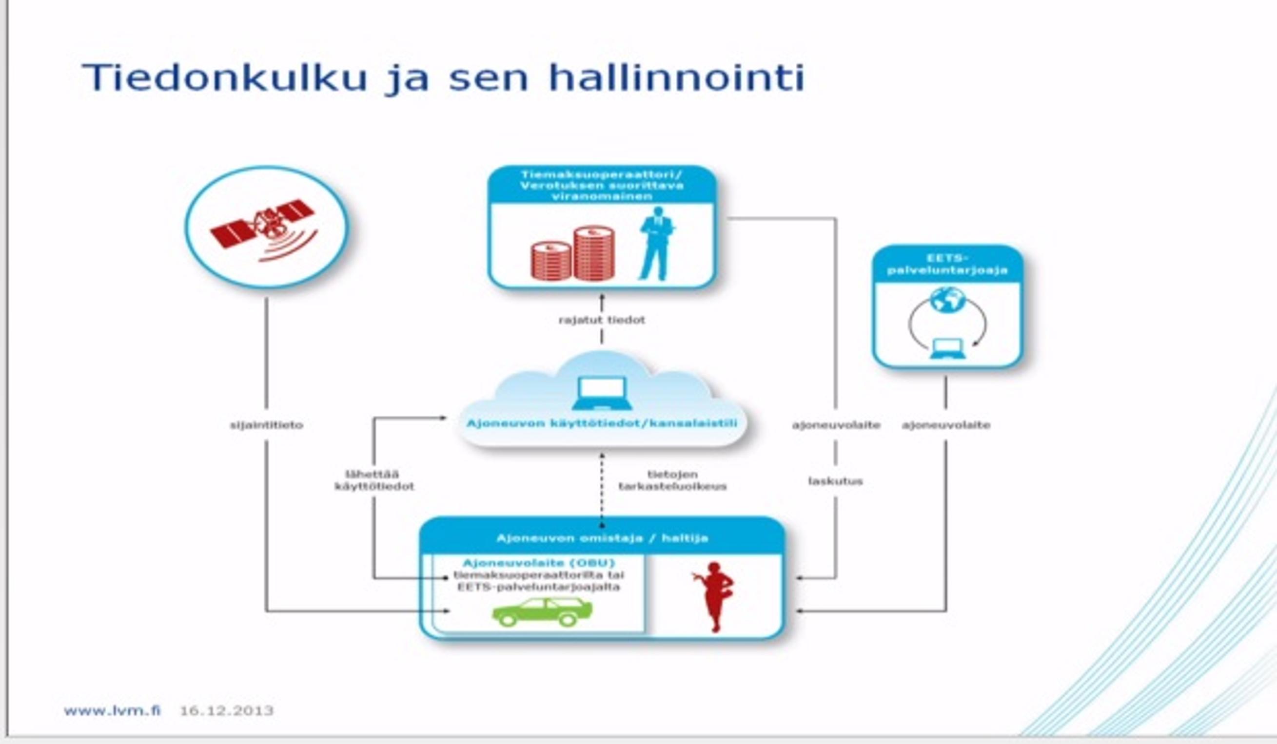 - Palvelun tarjoaja (tiemaksuoperaattori, EETS-palveluntarjoaja, yksityinen palveluntarjoaja) asentaisi ajoneuvolaitteen ja perisi autoilijalta noin 10 euron vuosimaksua.
