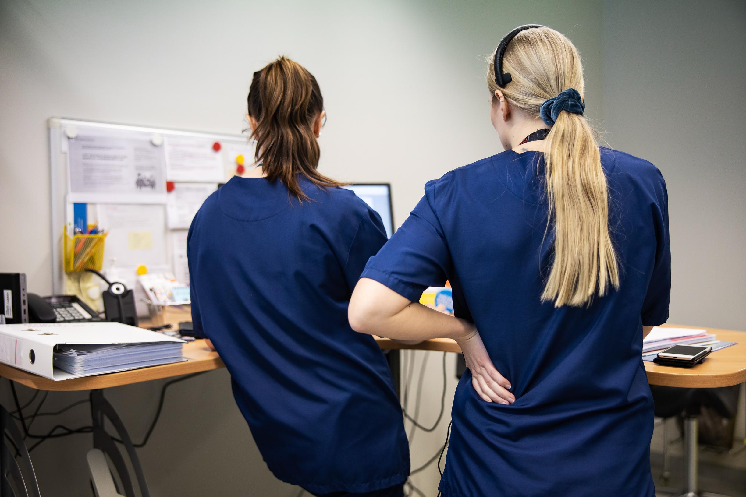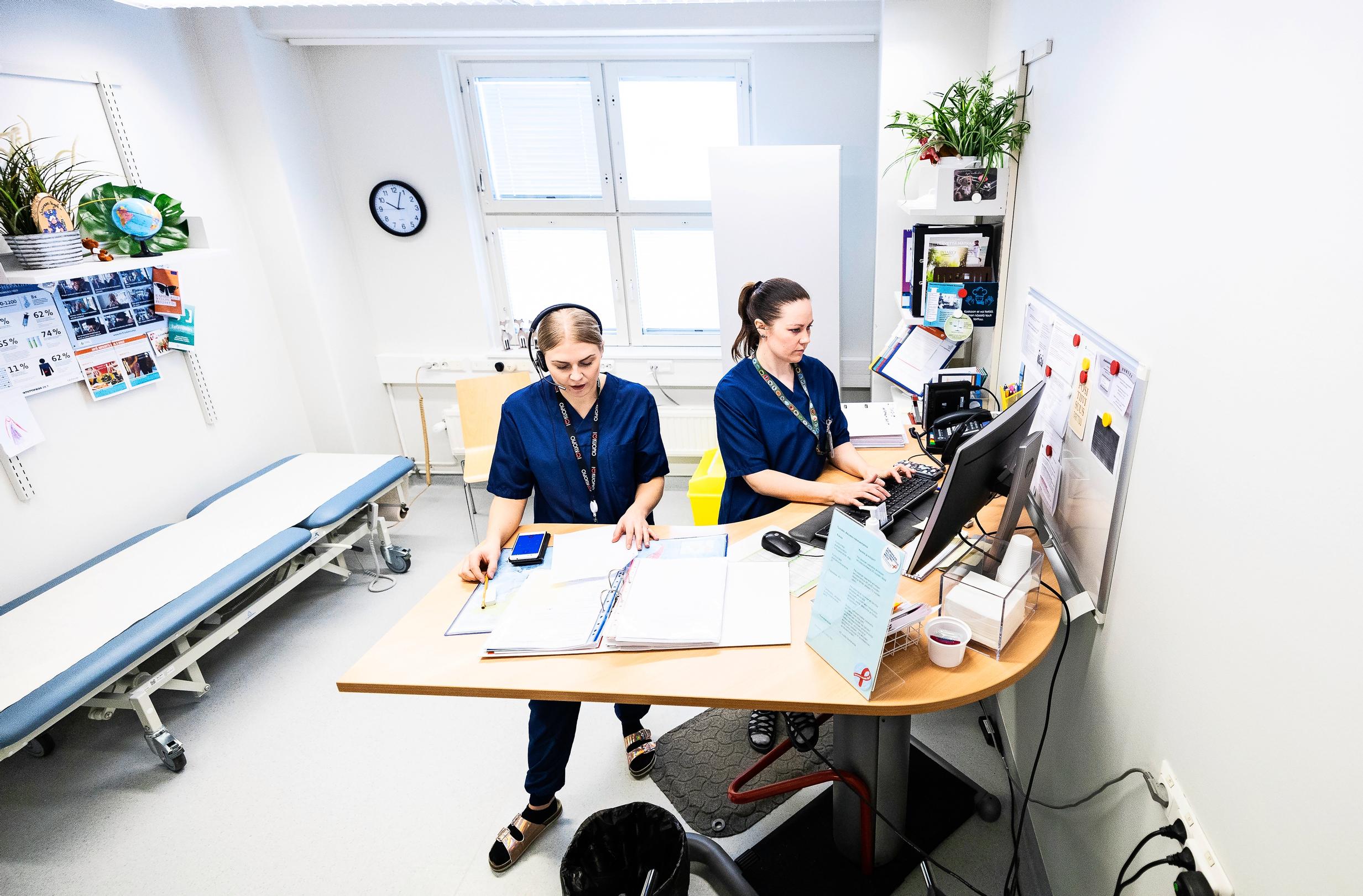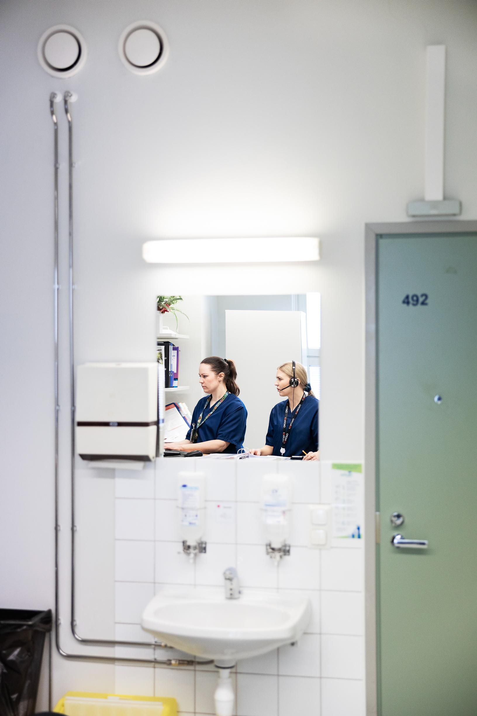 Kaksi hoitajaa viidestä ovat tartuntatautihoitajat Anniina Mäkelä ja Jaana Mustonen. He tarttuvat puhelimeen.