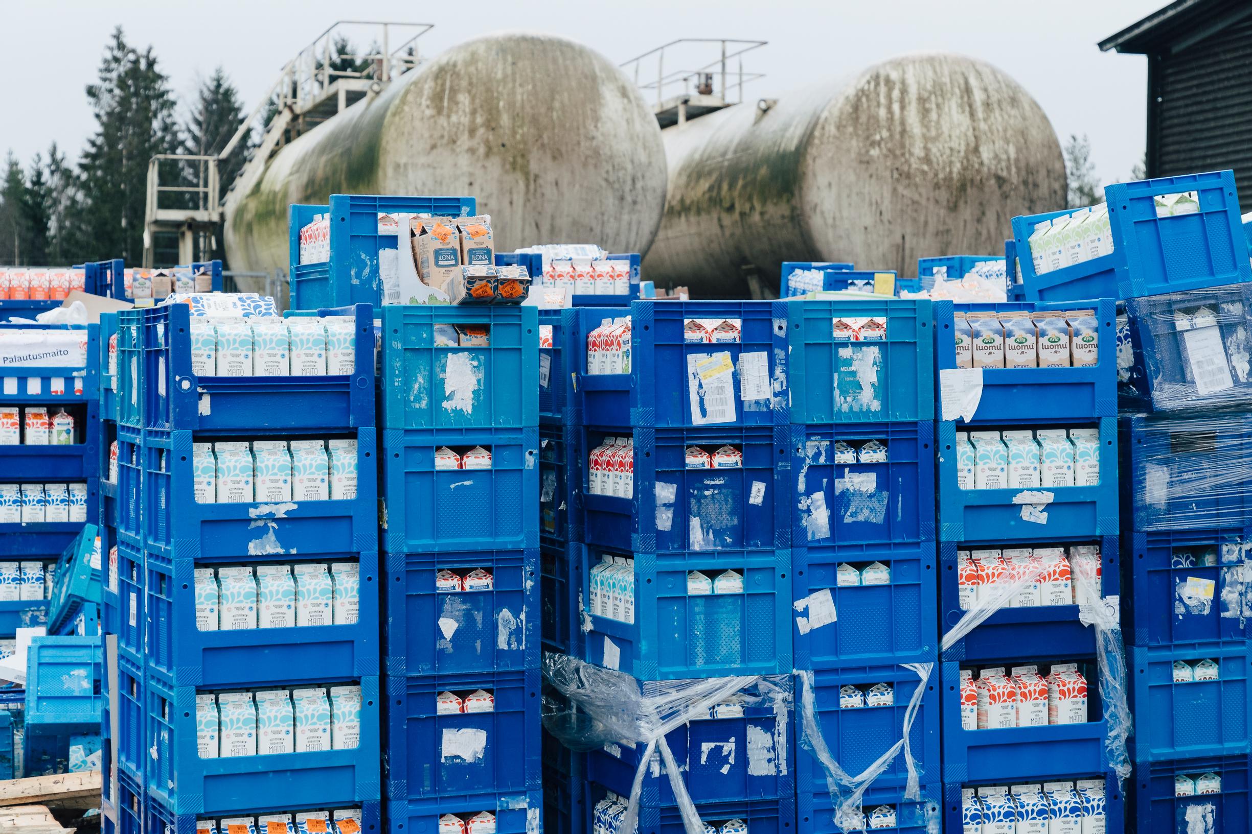 Käsittelyhallin edessä on läjittäin myymättä jääneitä maitotölkkejä.