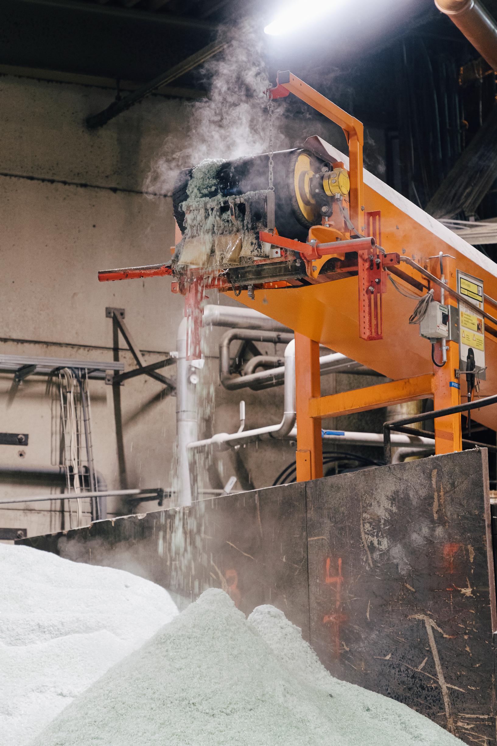 – Meillä valmistetaan kovia ja teknisiä eristeitä esimerkiksi laivateollisuuden ja elementtitehtaiden tarpeisiin. Prosessin lasinsulatuksessa 85 prosenttia lasista tulee kierrätyksestä: se on ikkuna- ja pullosirua.