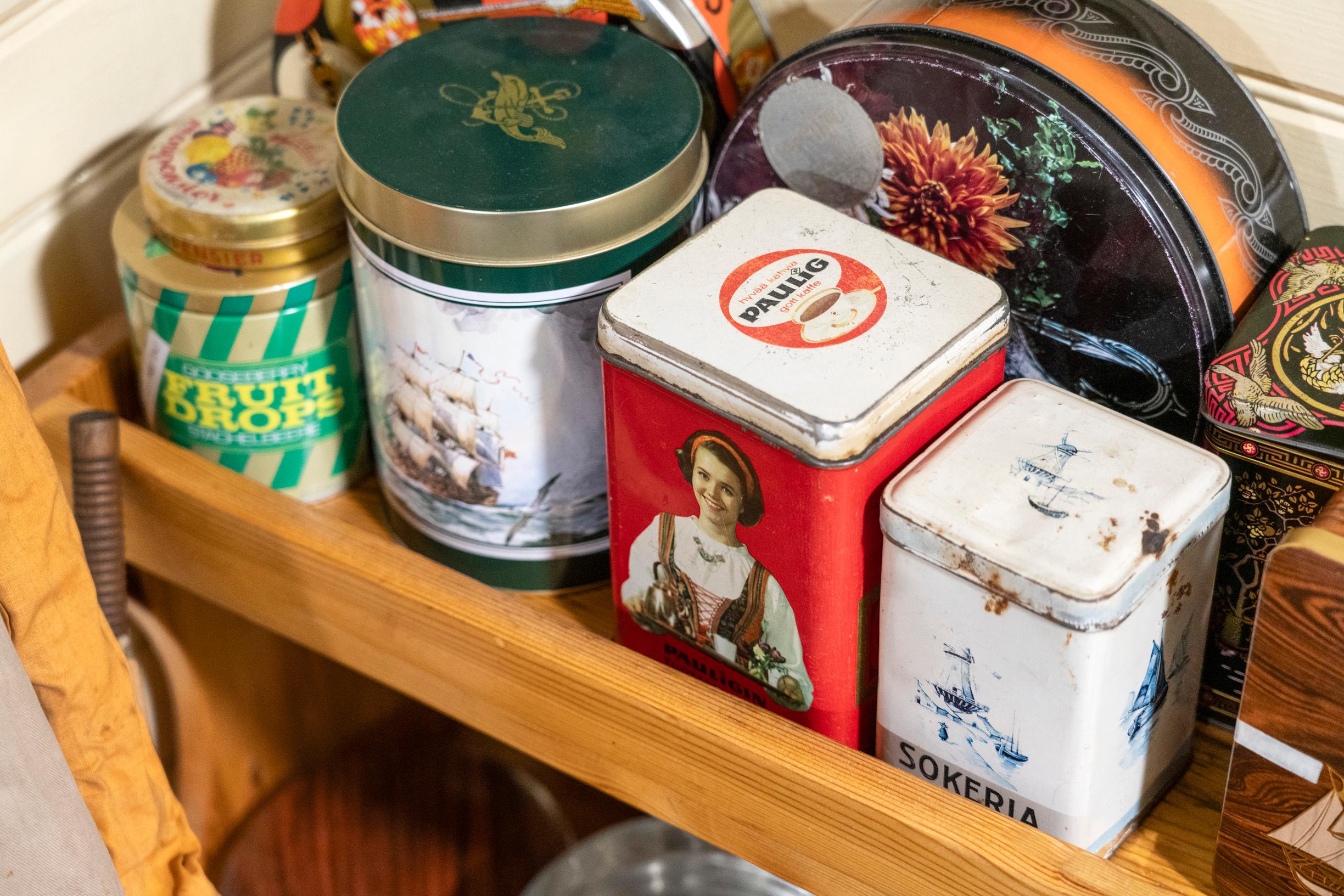 Kahviastioiden vieressä seinään kiinnitetyillä hyllyillä ovat sievästi ryhmissä Franckin Kartio-lasit ja Wirkkalan röpöläiset Niva-lasit, on Arabian maitokannuja, kermakoita ja sokerikkoja. Seinillä ympäri taloa on vuosilautasia Kalevala-aiheista Muumi-teemoihin sekä ainakin kuusi erilaista vedettävää seinäkelloa, tauluja ja raanuja.