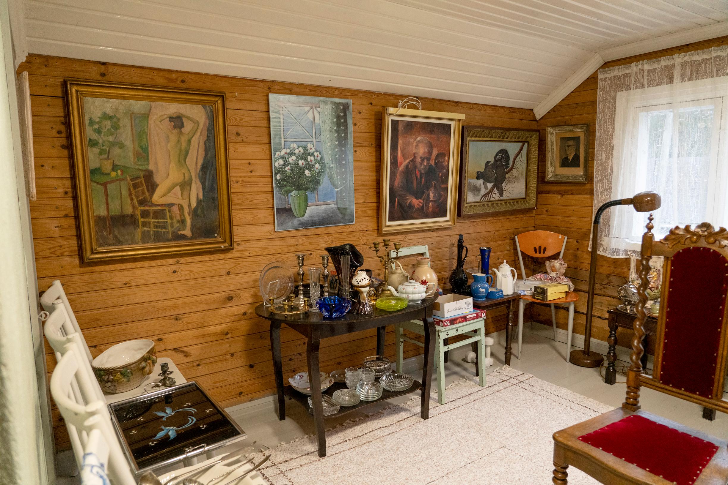 Pienessä–suuressa hirsitalossa ovat sulassa sovussa vintage, talonpoikaisantiikki, Barbiet, Tapio Rautavaarat, kuusikymmentäluvun kiiltokuvat ja korealaiset postimerkit.
