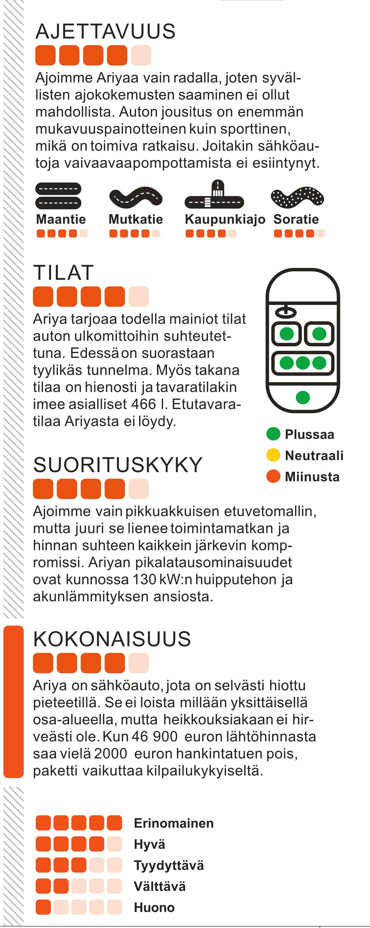 Ariyaan tutustuminen tapahtui viereisen sivun Qashqain tapaan moottoriradalla. Ajoimme etuvetoista pikkuakkumallia. Meno oli tämänkaltaiselle sähköautolle tyypillistä, eikä lyhyellä rata-ajolla suurempia ongelmia tullut vastaan. Iso massa tuntuu ja auto kallistelee, mutta muuten kulku on melko raikasta. Monille sähkömaastureille tyypillistä nyökkimistä ei Ariyassa esiintynyt. Ariya vaikuttaa kilpailukykyiseltä tuotteelta, joka varmasti löytää oman uskollisen ostajakuntansa.