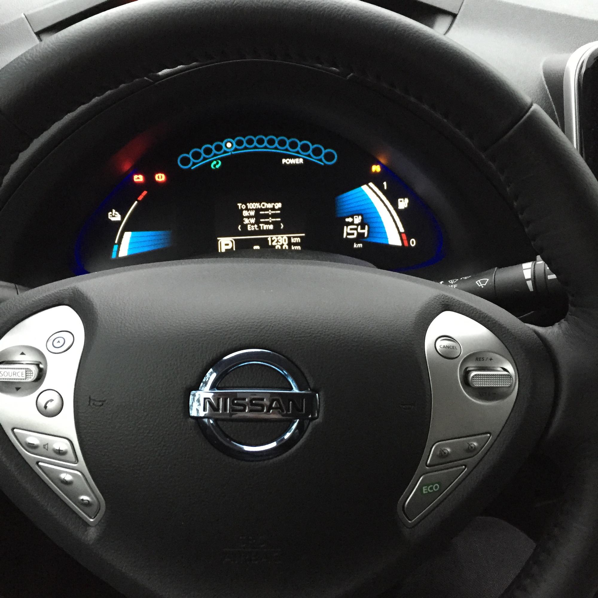 Nissan Leafin mittaristo on selkeä mutta ohjauspyörän nappulat harmillisen pieniä. Onneksi ohjauspyörä on lämmitettävä, ei noihin hanskat kädessä osuisikaan…