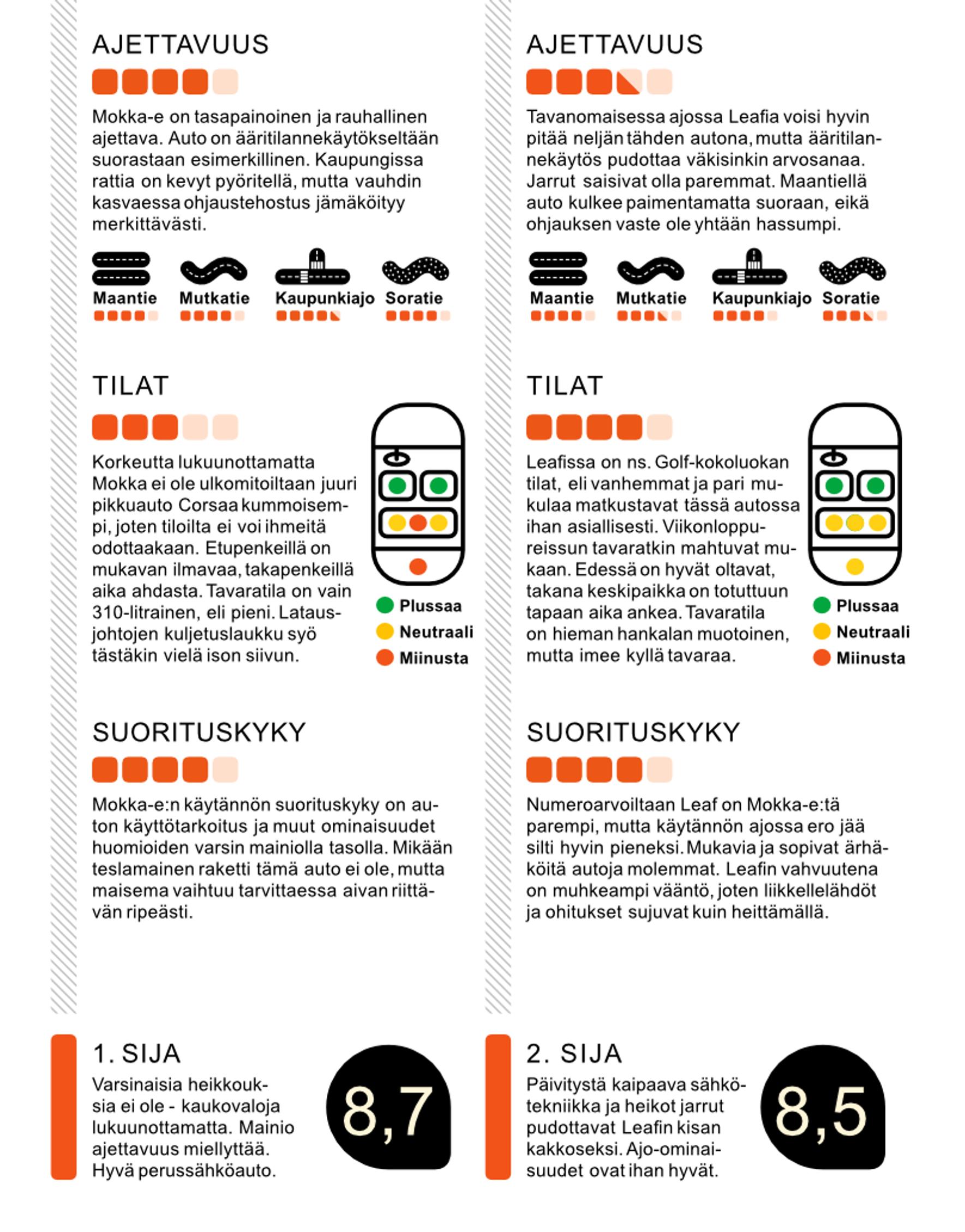 Nissan Leaf on huomattavasti vanhempi autokonstruktio kuin Opel Mokka-e, ja tämä näkyy vertailun eri osa-alueilla. Nissan kyykkää pahasti jarrukokeessa ja ääritilannekäytöksessä, mikä käytännössä vie mahdollisuudet taistella vertailuvoitosta. Opelin suoritus on kautta linjan tasapainoisempi: muiden virheistä on kenties osattu ottaa opiksi Mokka-e:n suunnittelussa. Molempien autojen osalta voidaan todeta, että pikkuakkuisellakin sähköautolla arjessa kyllä pärjää.