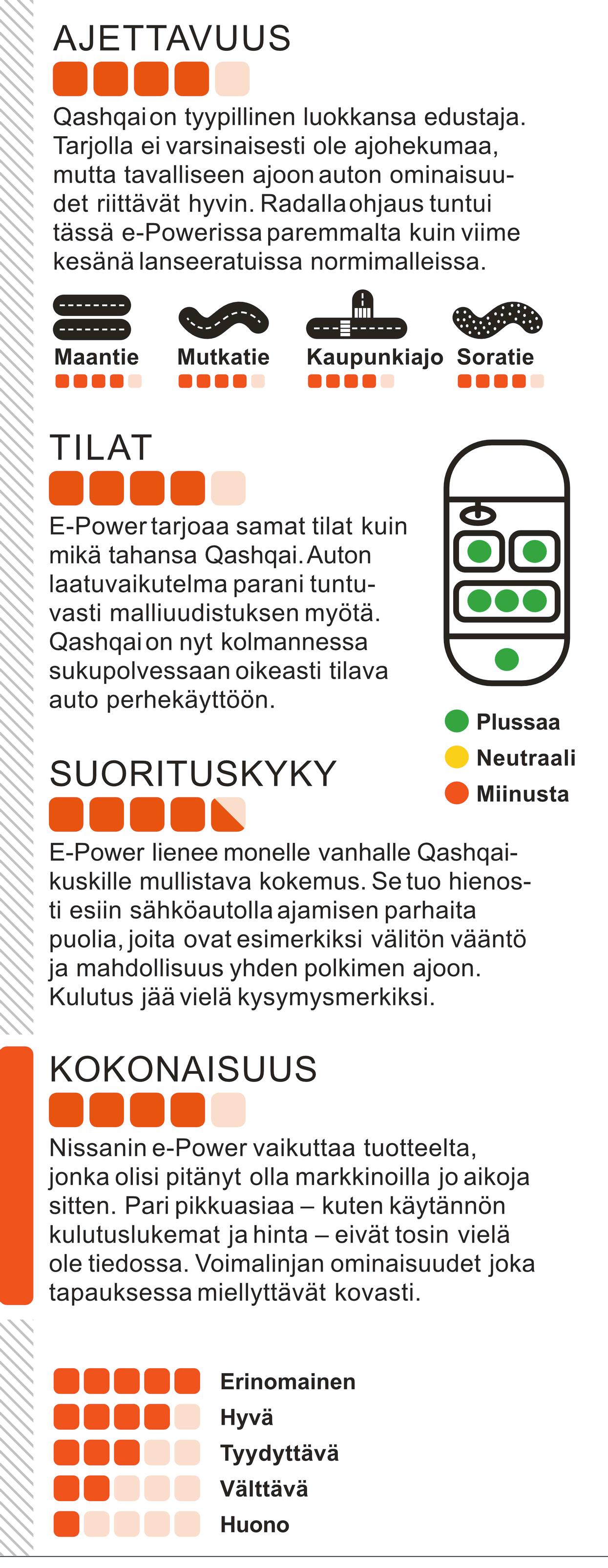 Käytännössä edellä mainittu tarkoittaa sitä, että e-Power on mukavuudeltaan ja miellyttävyydeltään ylivoimainen voimalinja Qashqain muihin moottoreihin verrattuna. Se tarjoaa myös aidosti sähköautojen parhaita puolia ajon aikana. Valitettavasti mallin hintoja ei ole vielä julkistettu, eivätkä käytännön kulutukset ole selvillä. Jäämme mielenkiinnolla odottamaan e-Powerin saapumista Suomeen, joka tapahtuu loppukesästä tai alkusyksystä 2022.