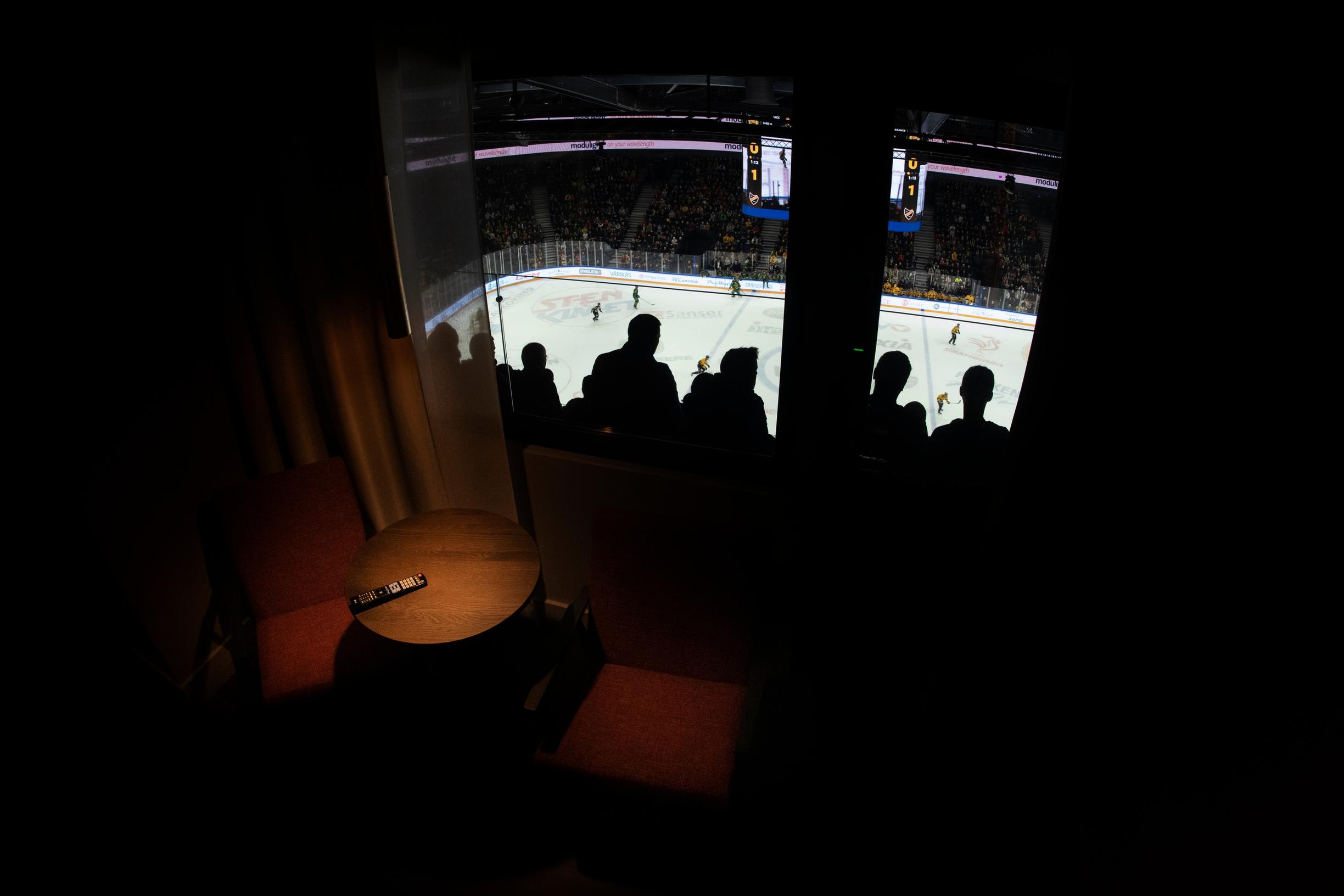 Katsomoiden ovet ovat kiinni, eikä niiden takana käynnissä olevasta kiihkeästä jääkiekko-ottelusta ole tietoakaan. Yhtä hyvin voisi olla ostoskeskuksen kirjastossa. Katsomon ja kaukalon ääniä ei kuulu tänne lainkaan. Seiniltä puuttuvat taulutelevisiot, joista voisi katsoa peliä. Steriiliin tilaan vuotaa edes hieman rosoa lonkerojuomiin erikoistuneen ravintolan kaiuttimista.
