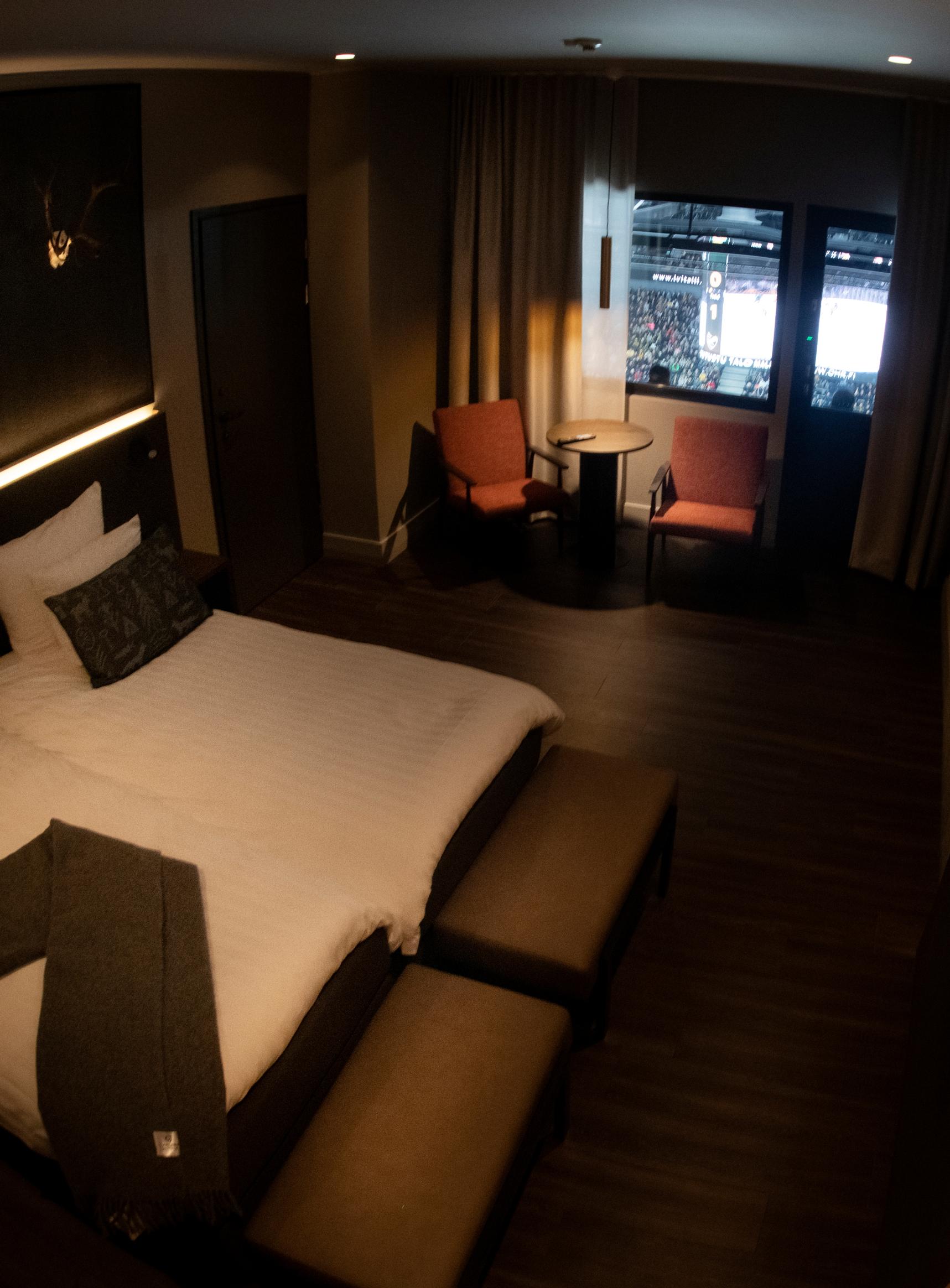 Aloitamme kaikkein pyhimmästä. Nokia-areenassa sijaitsevan Lapland-hotellin huoneesta avautuu ikkuna ja parveke katsomoon eli maljaan. Täältä voi seurata omassa rauhassa konserttia tai ottelua.