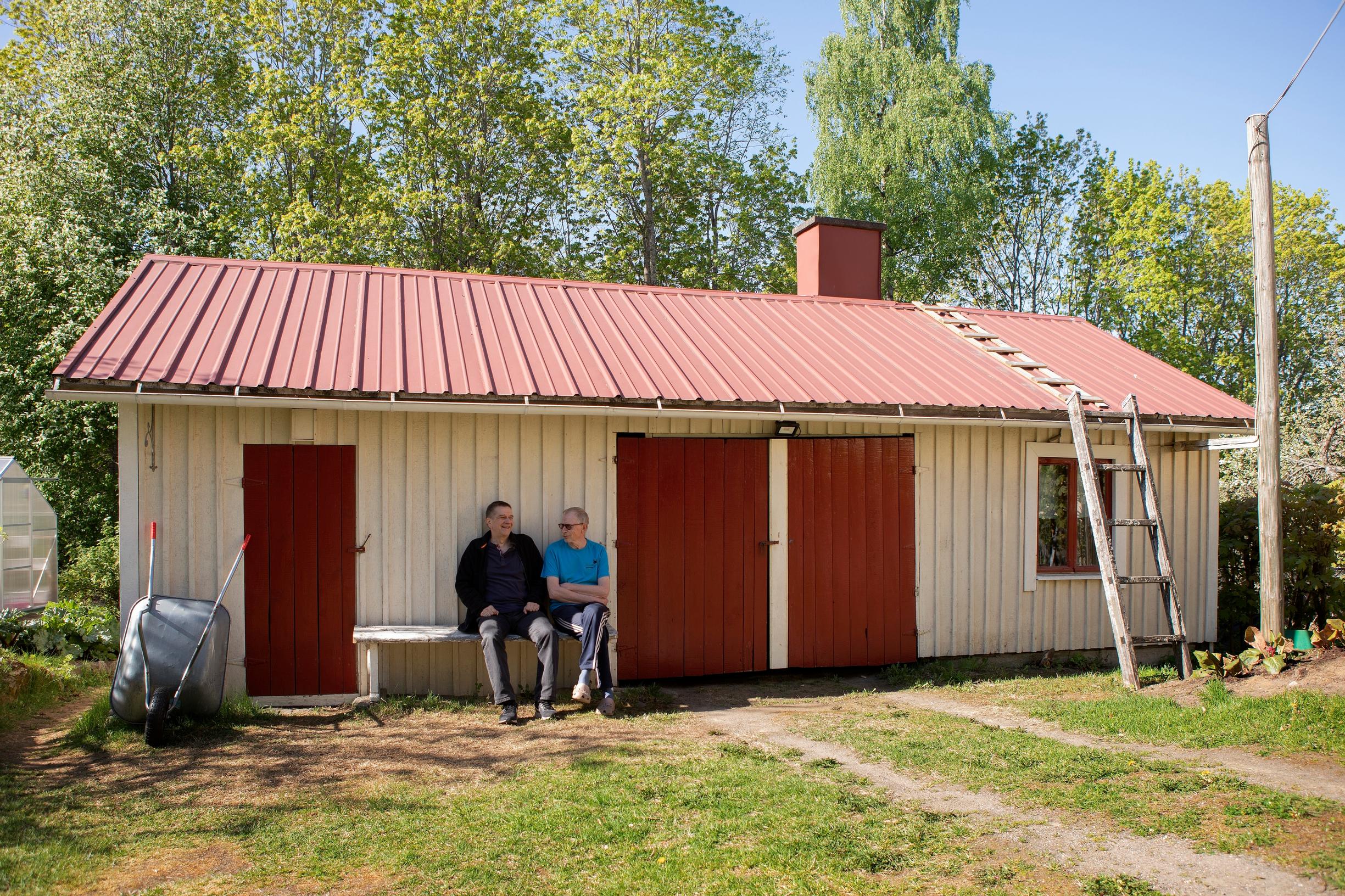Raimo asuu vuonna 1890 valmistunutta omakotitaloa, jossa toimi kauan sitten ensin keuhkosairaala, sitten Myllymäen poliisilaitos putkahuoneineen. Miehet turisevat piharakennuksen seinustan penkillä.