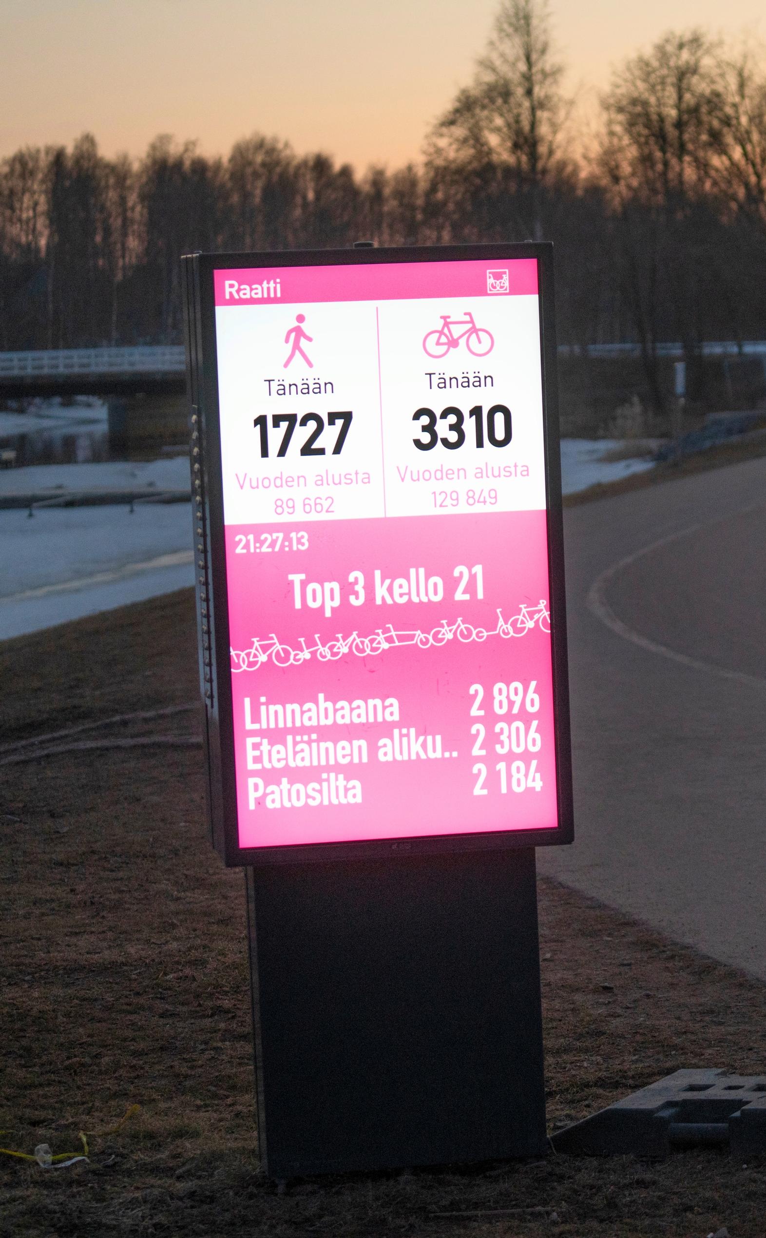 Yhdenmukaisella viestillä voi ajan mittaan olla vaikutusta. Kaupunki on asettanut pyöräteiden varsille näyttötauluja, joista näkee päivittäiset liikkumismäärät.