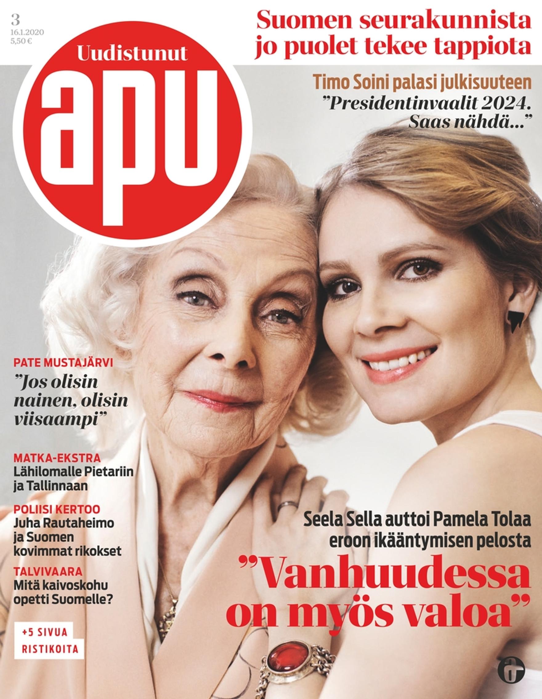 Nyt jännittää! Yli puolen vuoden urakka on ohi, ja ensimmäinen uudistunut Apu on ilmestynyt. Kysyimme teiltä, mitä te lehdeltänne haluatte. Toivoitte lisää syvällistä luettavaa. Täältä sitä tulee. Lehden alussa on nyt laaja ajankohtaismakasiini Ajastin, jossa kerromme uutisia kotimaasta, jututamme viikon henkilöä, luemme maailman lehdet ja tartumme kuumiin puheenaiheisiin.