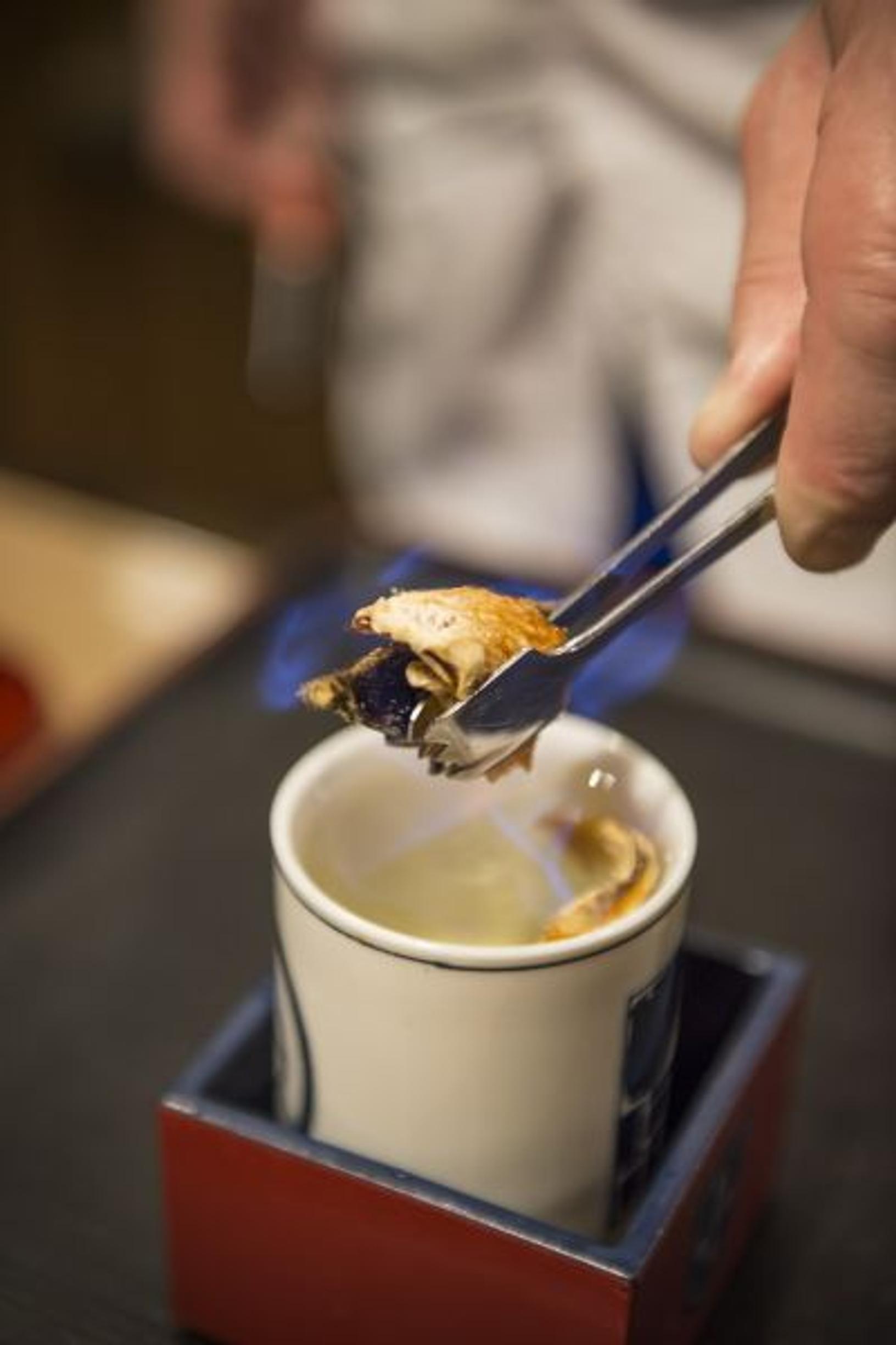 Takahashi pitää palloa kämmenellään näytillä, kunnes siirtää sen veteen, tuiki tavalliseen siniseen ämpäriin. Vilkkaalla kadulla kävelevät turistit pysähtyvät ihmettelemään ja ottamaan kuvia näystä, kunnes keittiömestari kantaa ämpärin takapihan kautta keittiöön. Ravintolan edessä olevassa akvaariossa uiskentelevat kalat eivät ole koristeena. Ne on tarkoitettu syötäväksi.