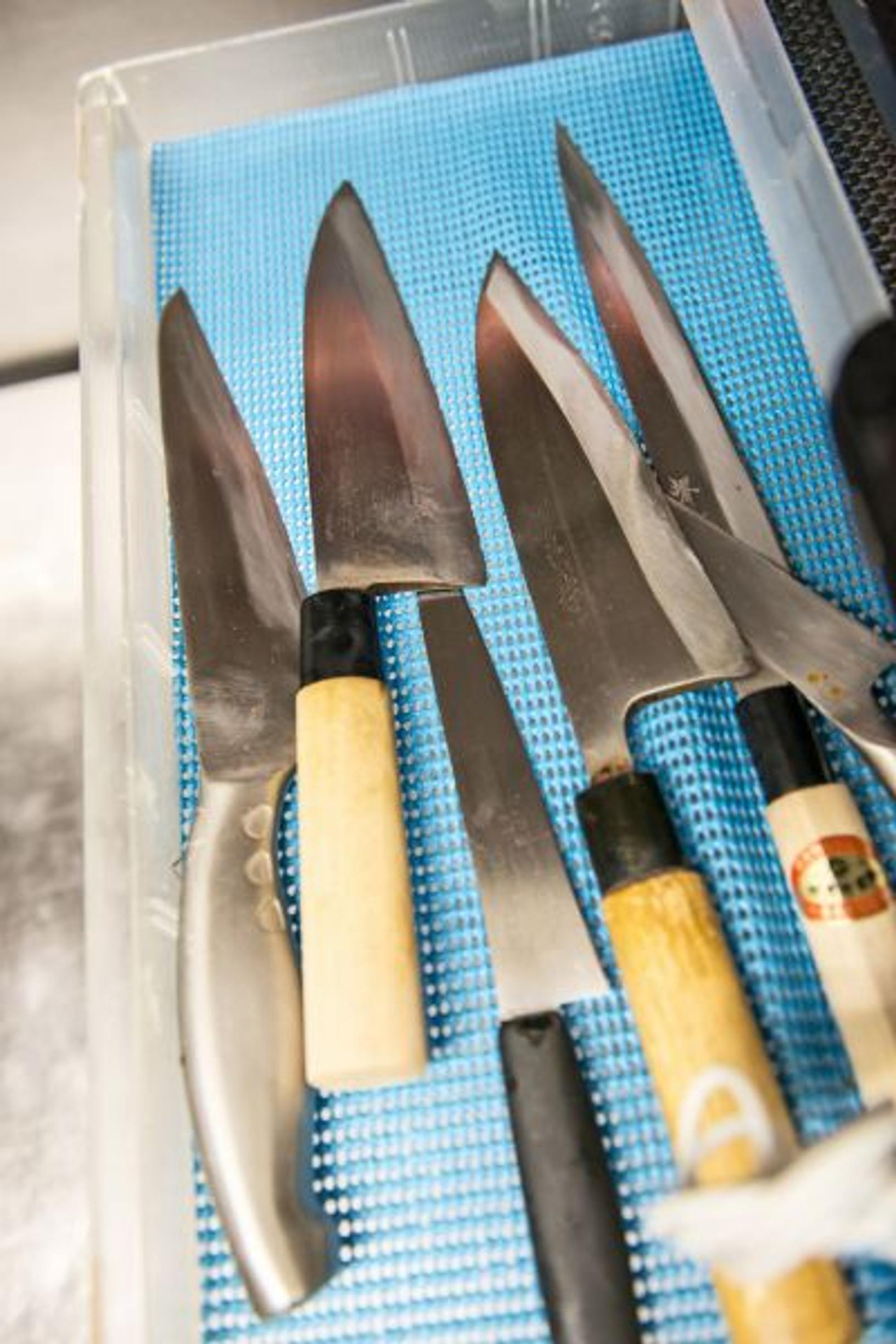 Evät lähtevät nopeilla viilloilla ensin. Ne menevät käytettävien puolelle. Sitten Takahashi tekee syvät viillot kiduksiin, irrottaa osan päästä, silmät ja niin edelleen. Hetken kalan keuhkot vielä toimivat, kunnes se lakkaa liikkumasta.