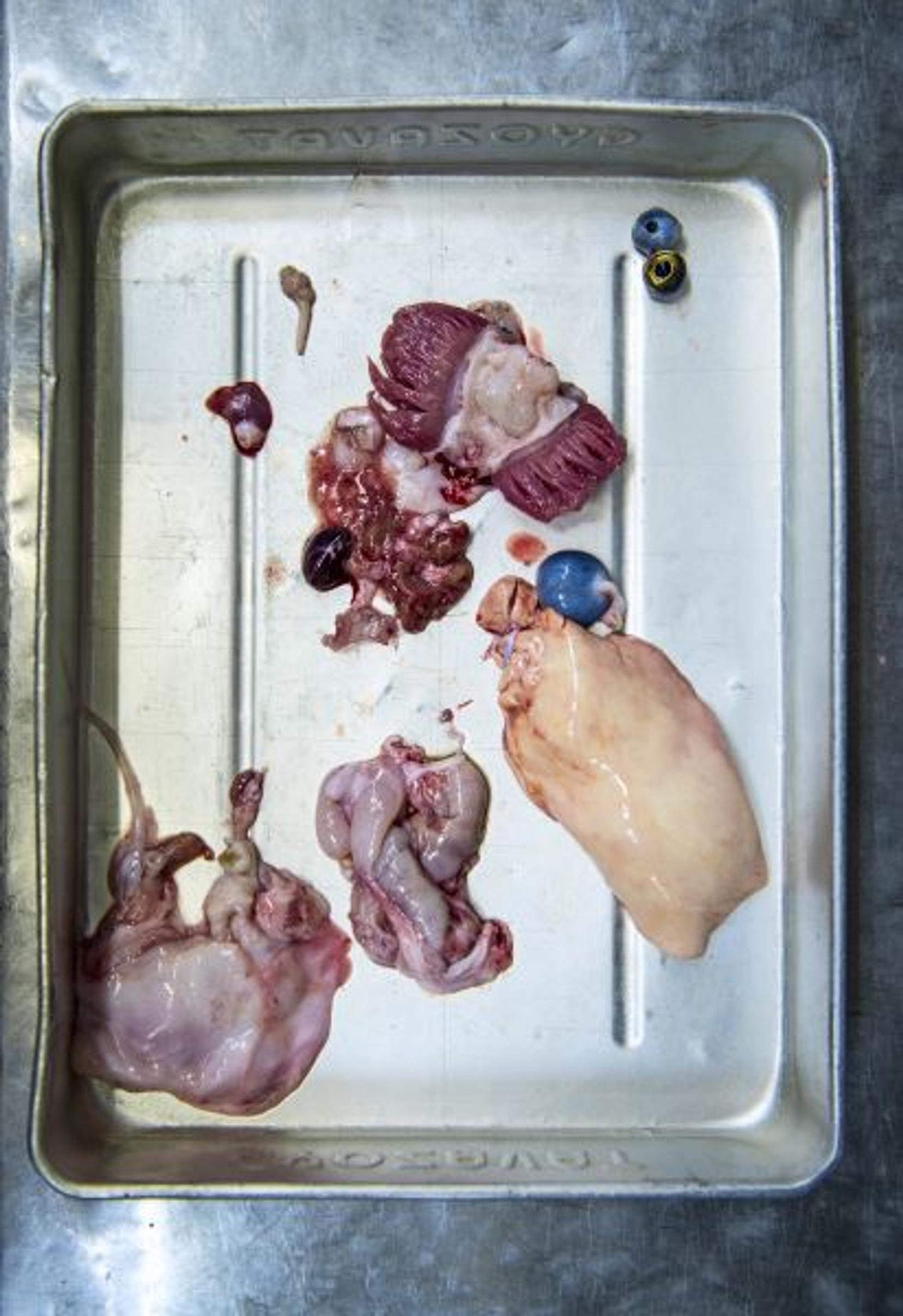 Alle viidessä minuutissa edessä on kaksi tarjottimellista: toisessa nahka, silmät, edelleen sykkivä sydän, munasarjat ja sisäelimet. Toisessa on loppuosa pallokalasta.