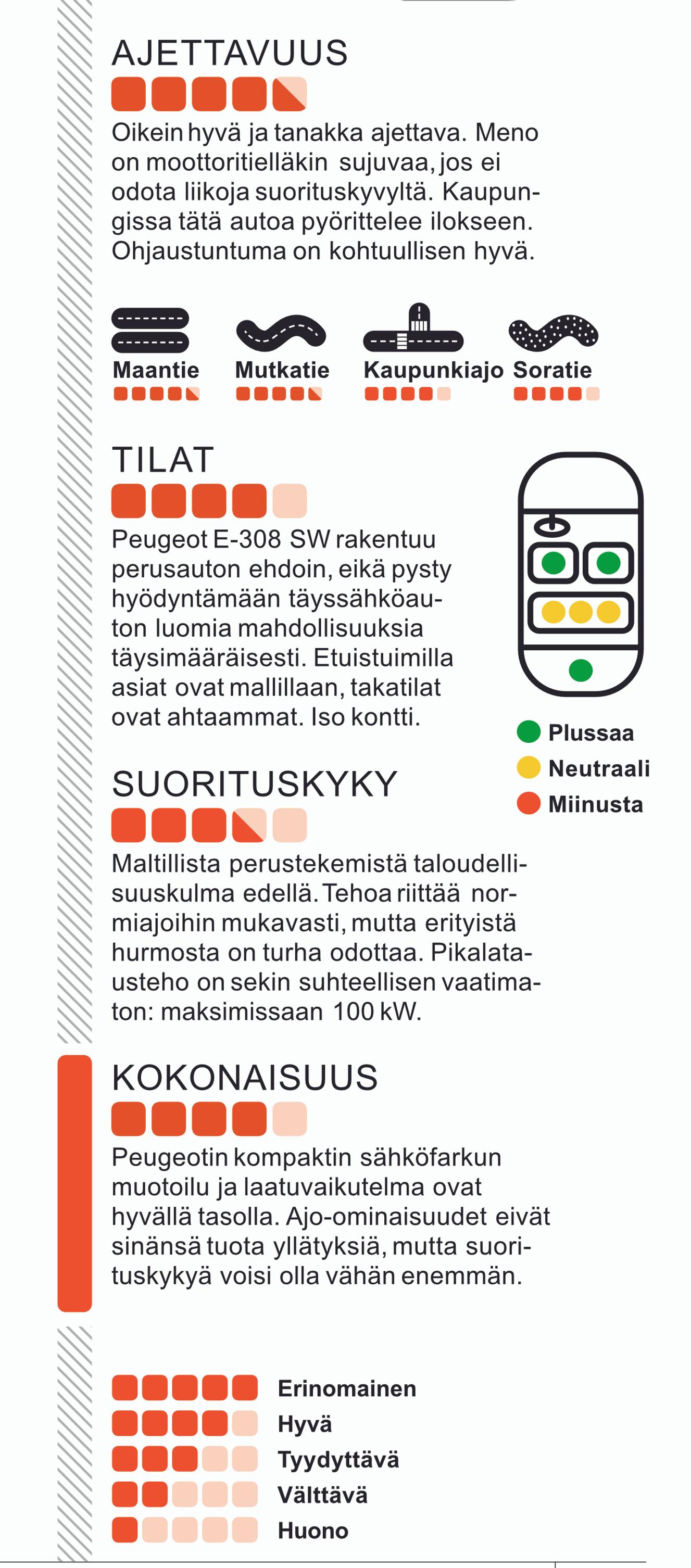 Peugeotin täyssähköinen 308-farmari tarjoaa maltillista perustekemistä taloudellisuuskulma edellä. Tehoa riittää normiajoihin mukavasti, mutta erityistä hurmosta on turha odottaa.