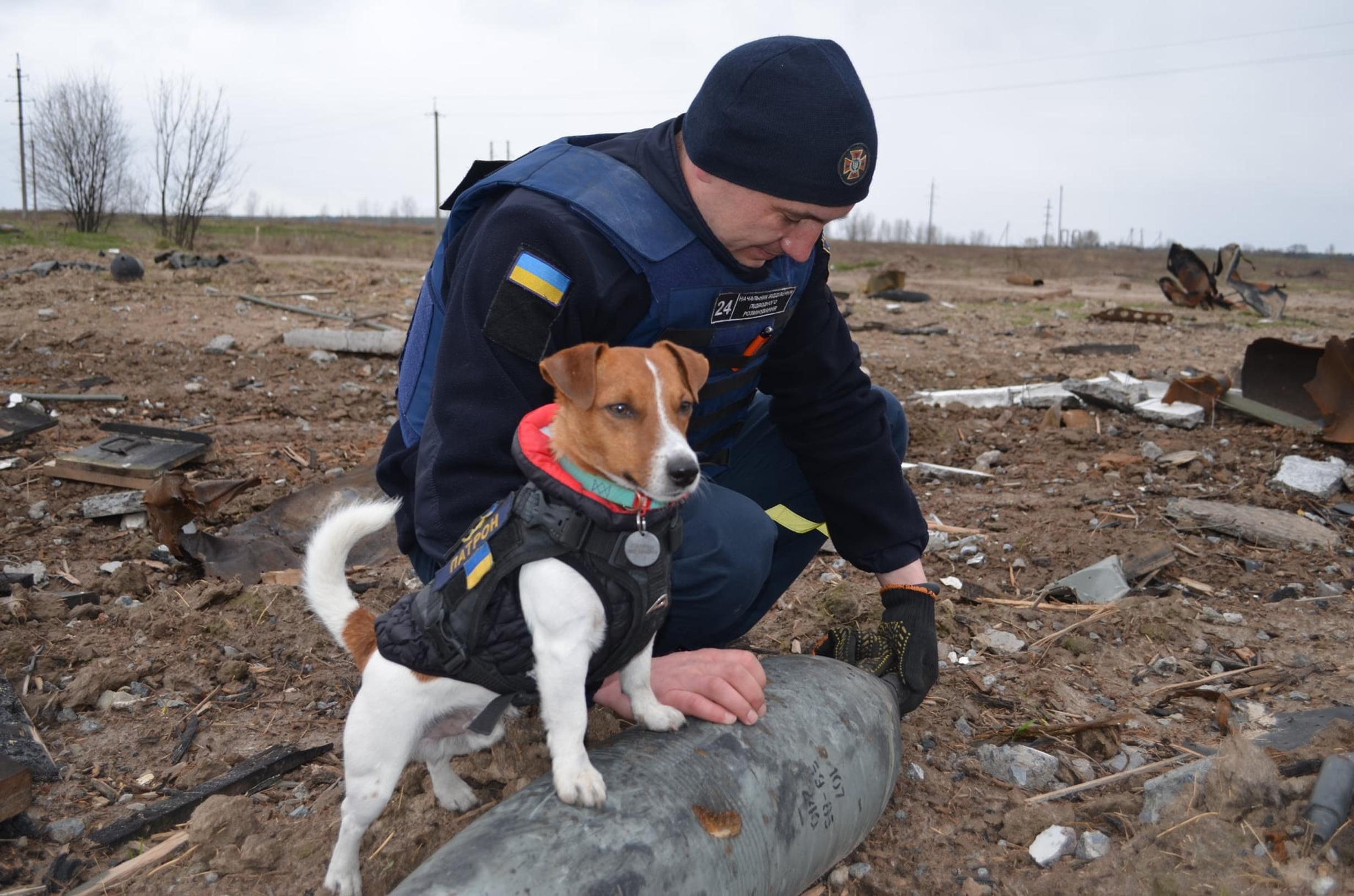 Ukrainan hätätilaministeriön maskotikseen nimeämä 2,5-vuotias jackrusselinterrieri etsii venäläisten jälkeensä jättämiä miinoja ja räjähteitä.