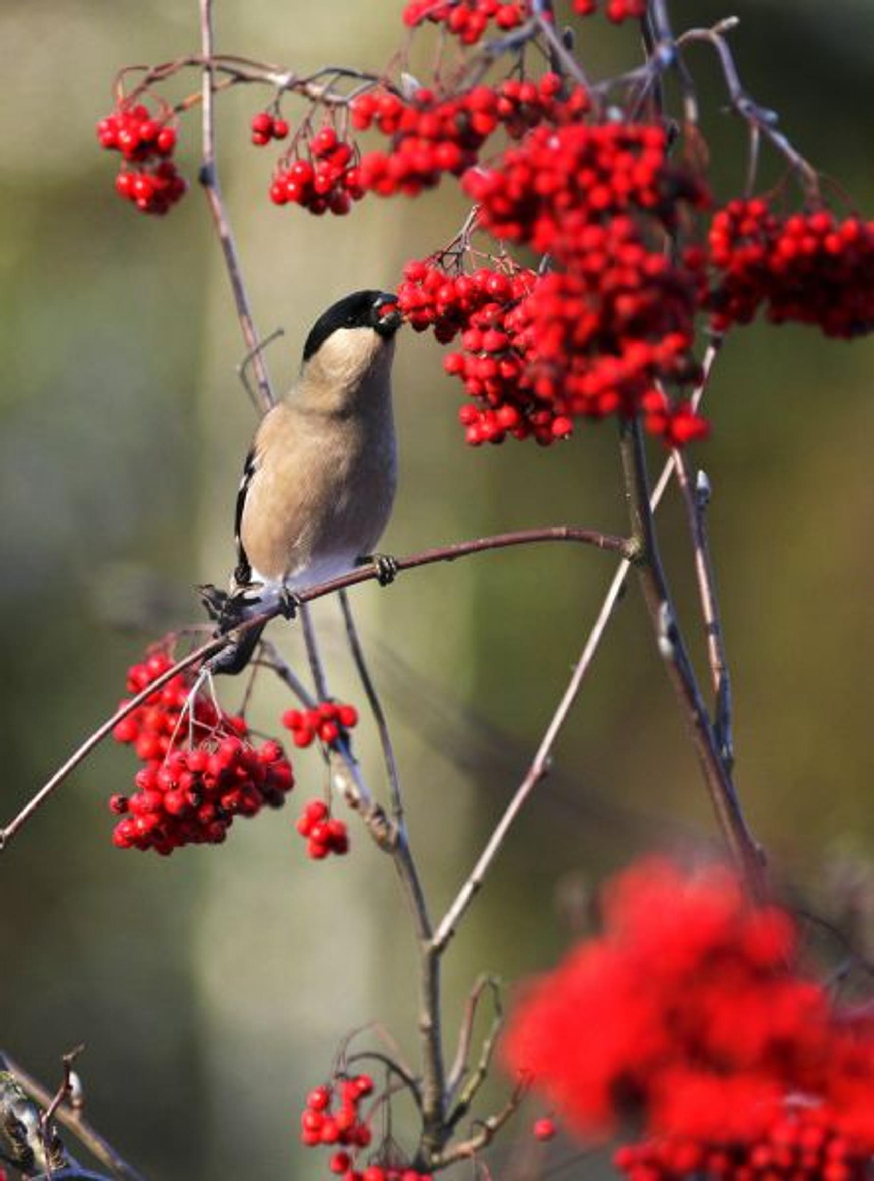 Punatulkku on yksi monista linnuista, jotka pitävät pihlajanmarjoista.