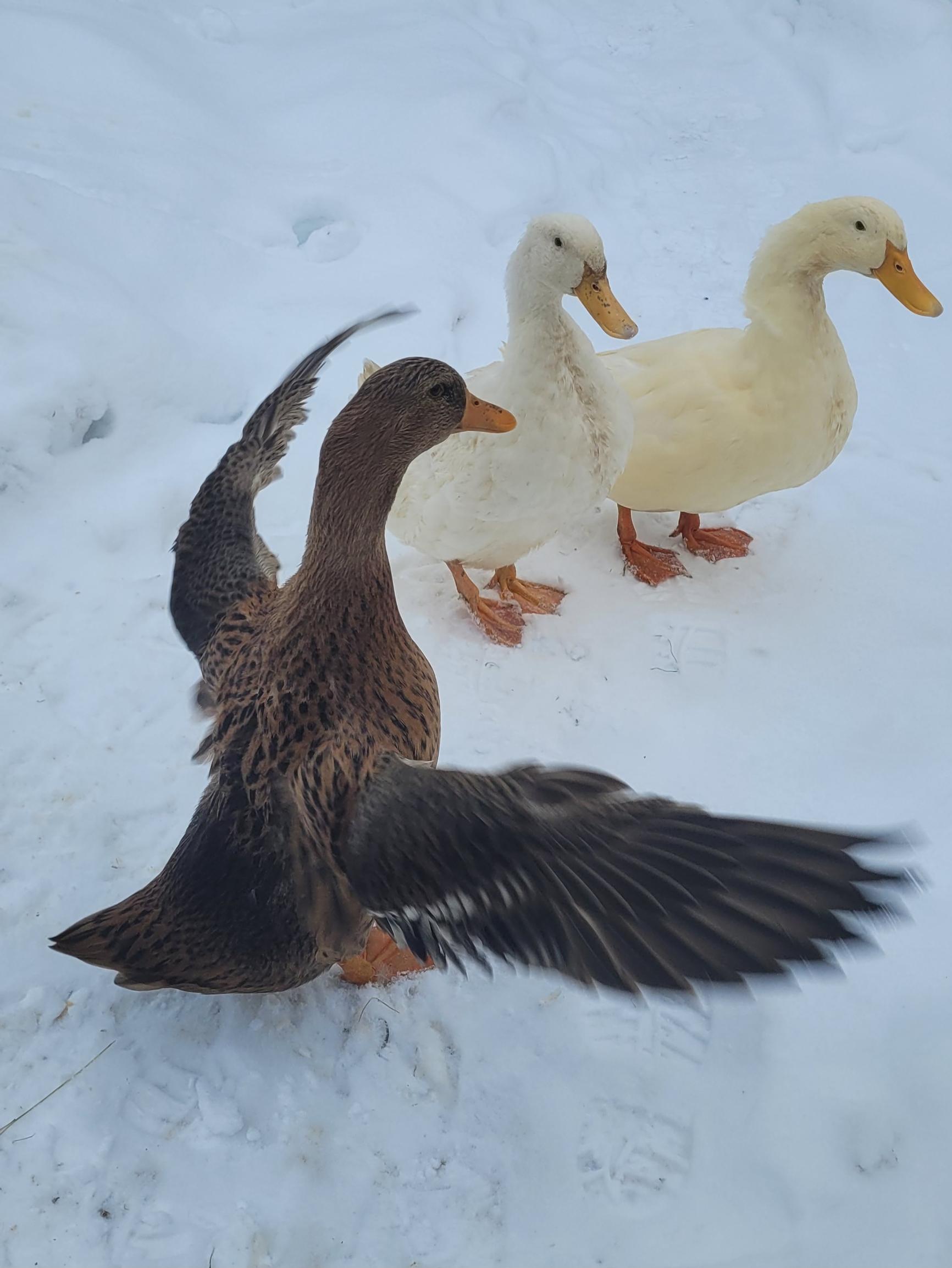 Parven jäljellejääneet jäsenet Touho ja Mini etsivät Pikkuankkaa, ja näytin sen niille, kun tulimme kotiin eläinlääkäristä. Ankat ovat viisaita ja ne ymmärsivät, että Pikkuankka on pois – ne höpöttivät sille hiljaa, eivätkä etsineet enää.