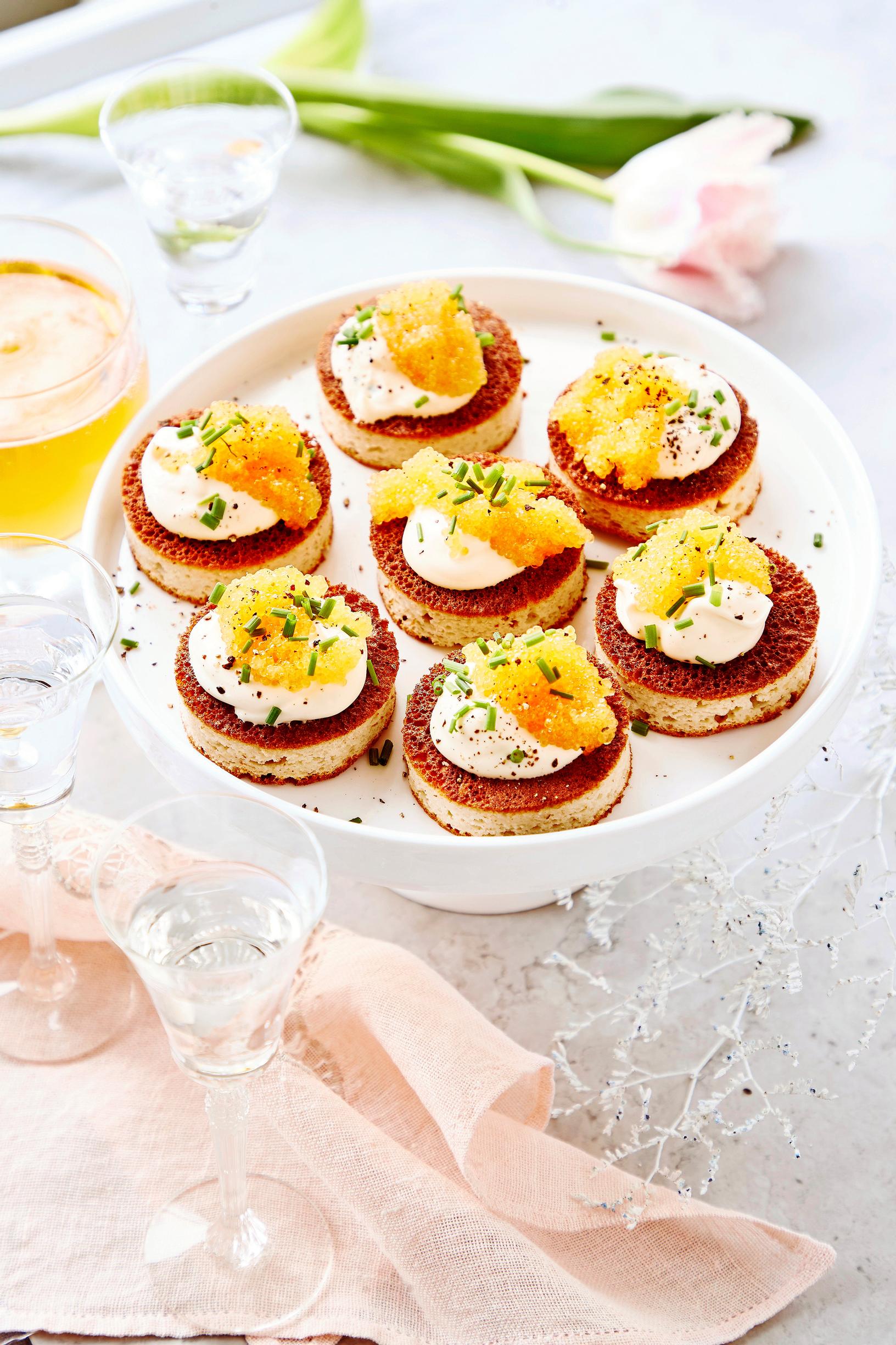 - Lusikoi miniblineille smetanaa ja valutettua mätiä. Rouhaise päälle mustapippuria myllystä ja viimeistele annos ruohosipulisilpulla. Tarjoa miniblinit snapsin ja oluen kanssa.