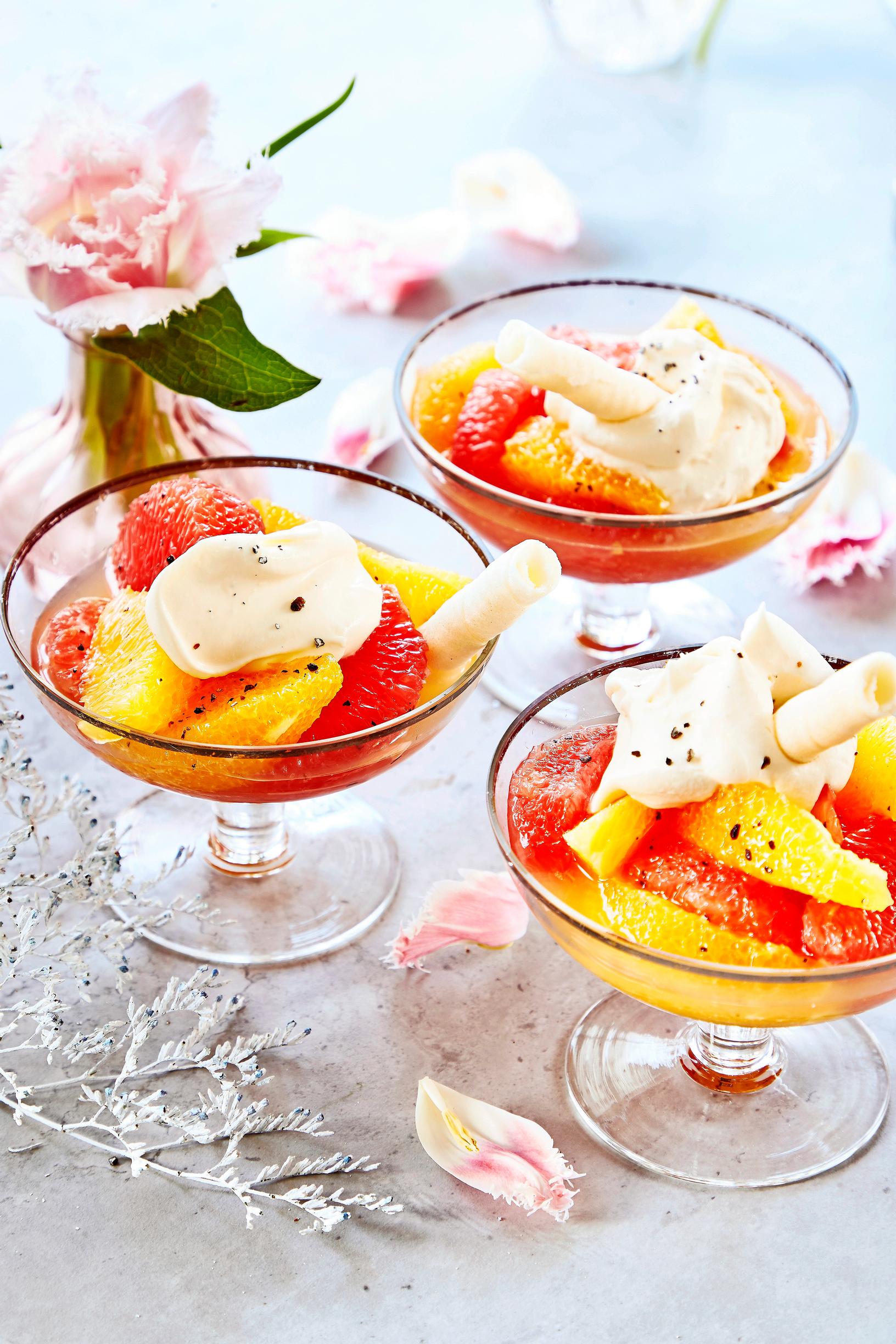 - Jaa sitruslohkot ja marinadilientä annosmaljoihin. Lusikoi päälle mascarponevaahtoa. Koristele. ●