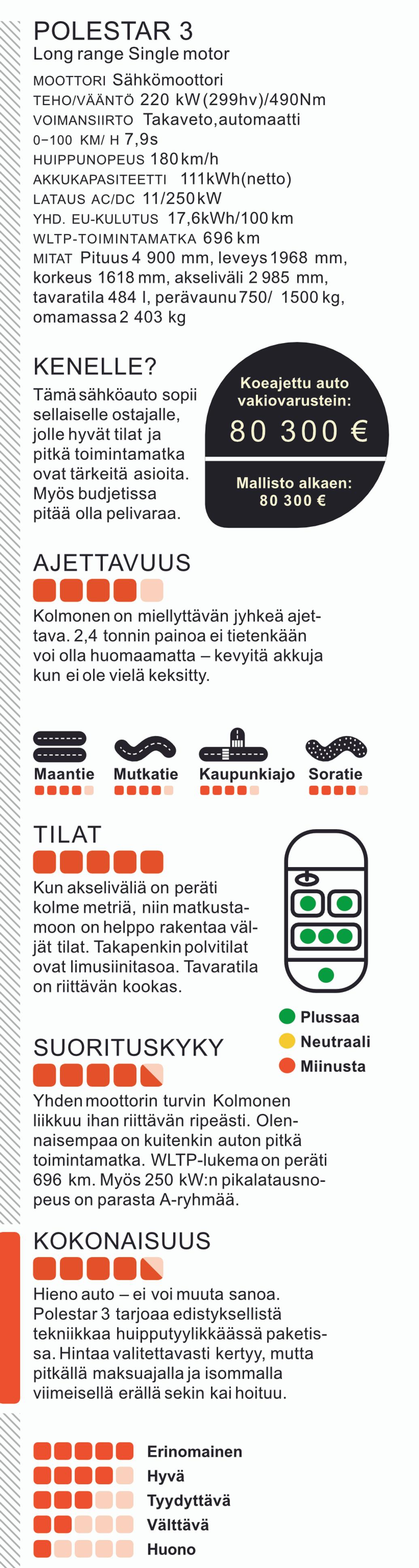 Polestar 3 on hieno auto, jossa on edistyksellistä tekniikkaa tyylikkäässä paketissa. Kerrankin sähköauto, jota ei tarvitse olla koko ajan lataamassa. Ja hinta on sen mukainen.