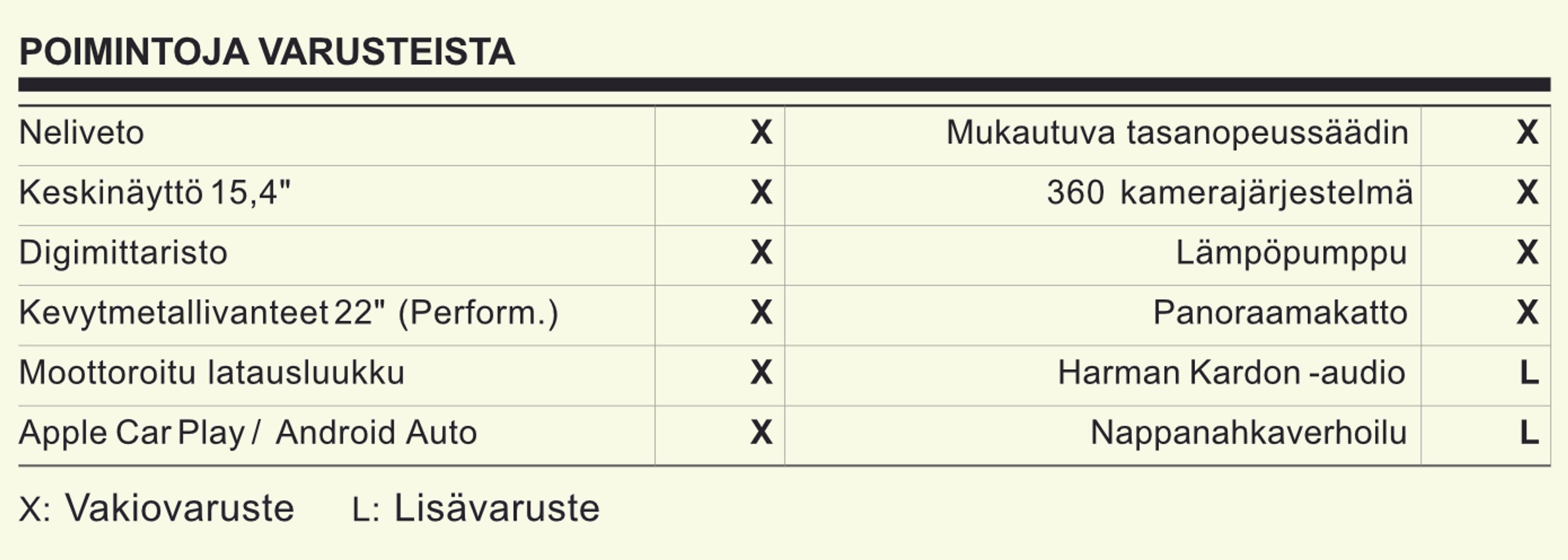 Digimittaristo on onneksi perinteisellä paikallaan, mutta esimerkiksi tuulilasinäyttö, lämmitettävä ohjauspyörä, tavaratilan kannen hands-free-avaustoiminto ja Harman Kardonin mainio audiojärjestelmä tulevat vasta arvokkaan Plus-paketin mukana.