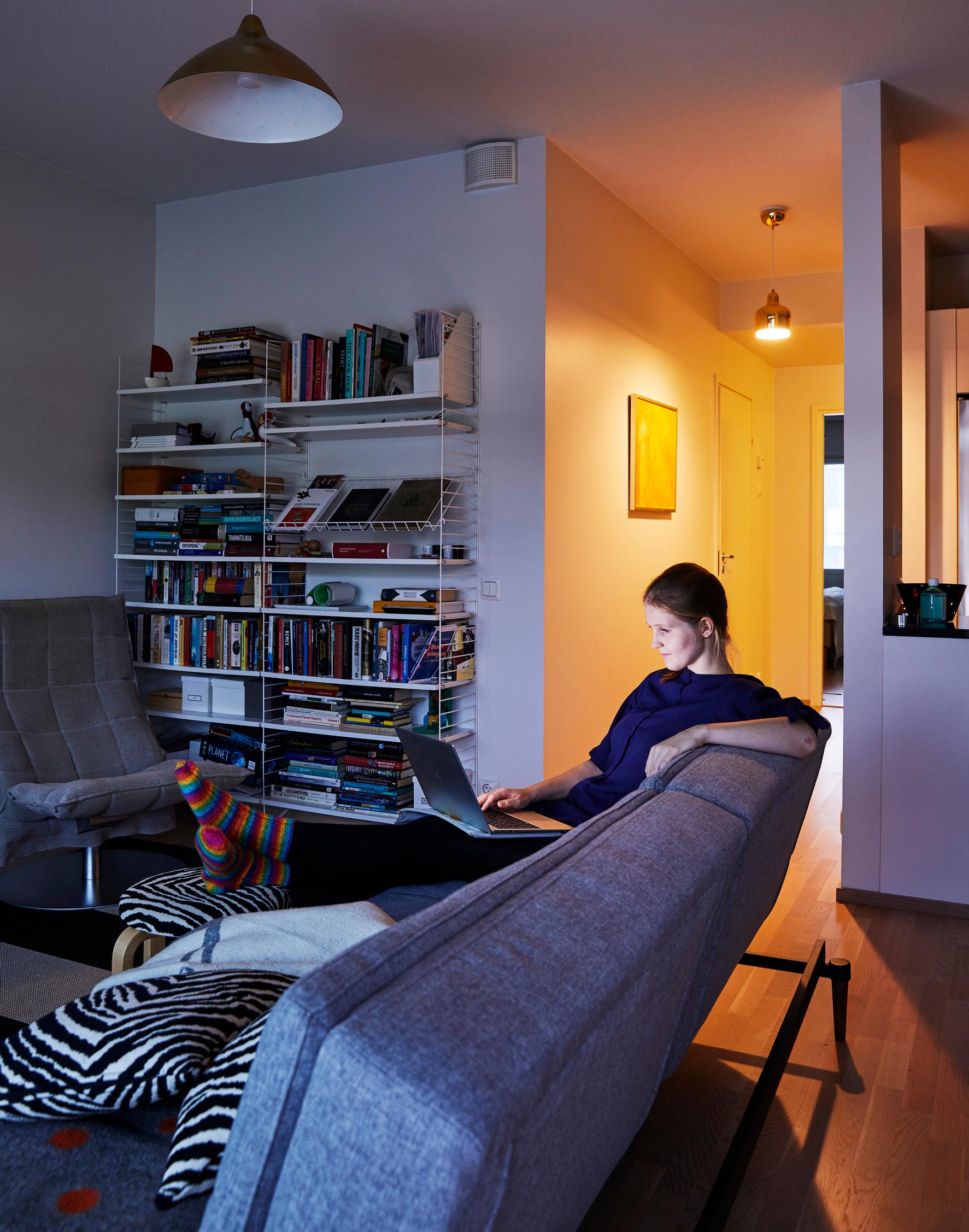 ”Me molemmat tykätään sisustuksessa tämmöisestä yksinkertaisesta. Ja Artekista. Aika vaaleetahan täällä on. Noilla lampuilla on jotkut nimet, mutta en mä muista niitä. Puoliso on meistä innokkaampi sisustaja.”