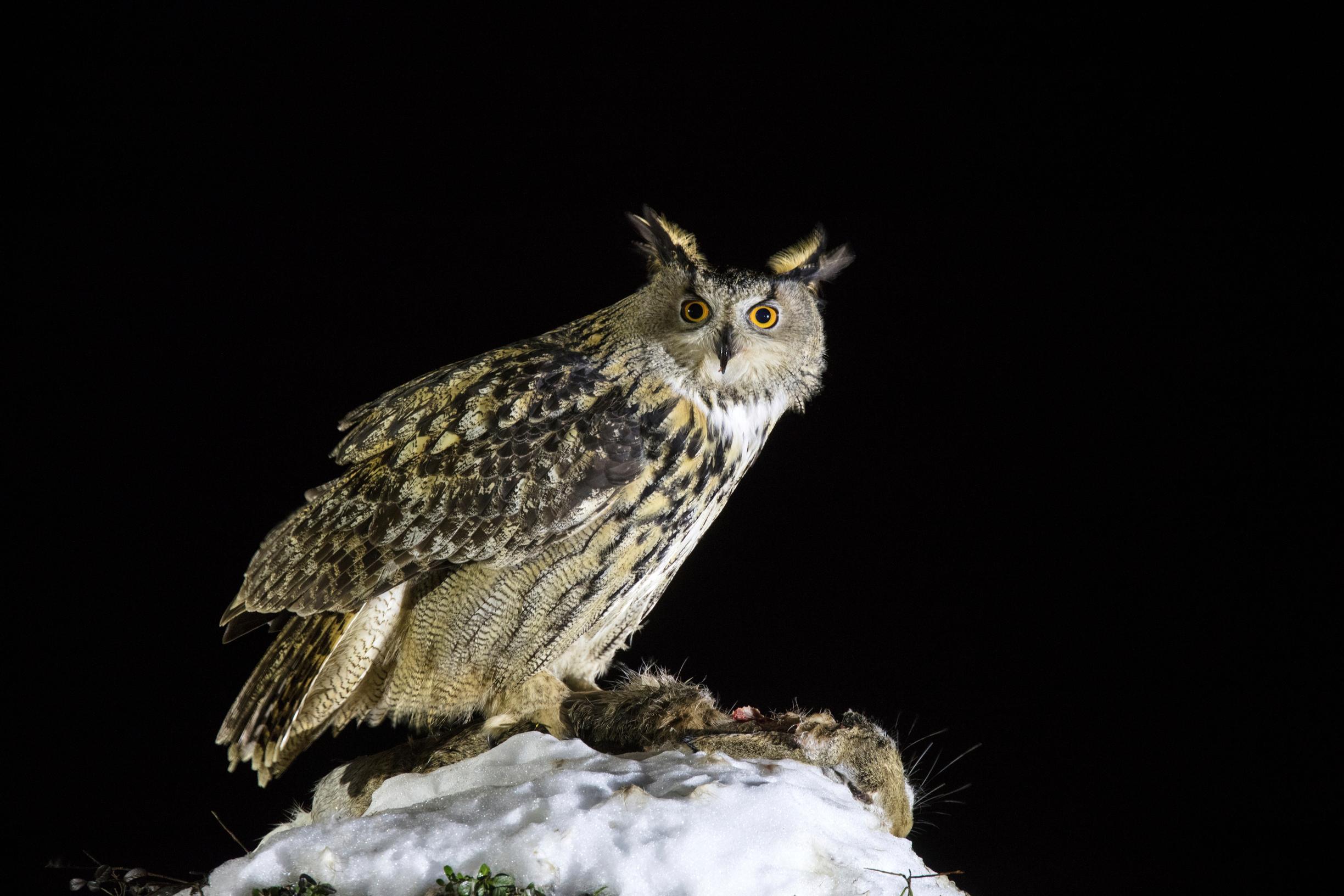 Sehän on ikään kuin asiallinen otus! Toden totta, tämä pitkäkorvainen pöllö ei varsinkaan talvisaikaan paljon hötkyile, vaan keskittyy tiukasti perusasioihin: syömiseen ja nukkumiseen.